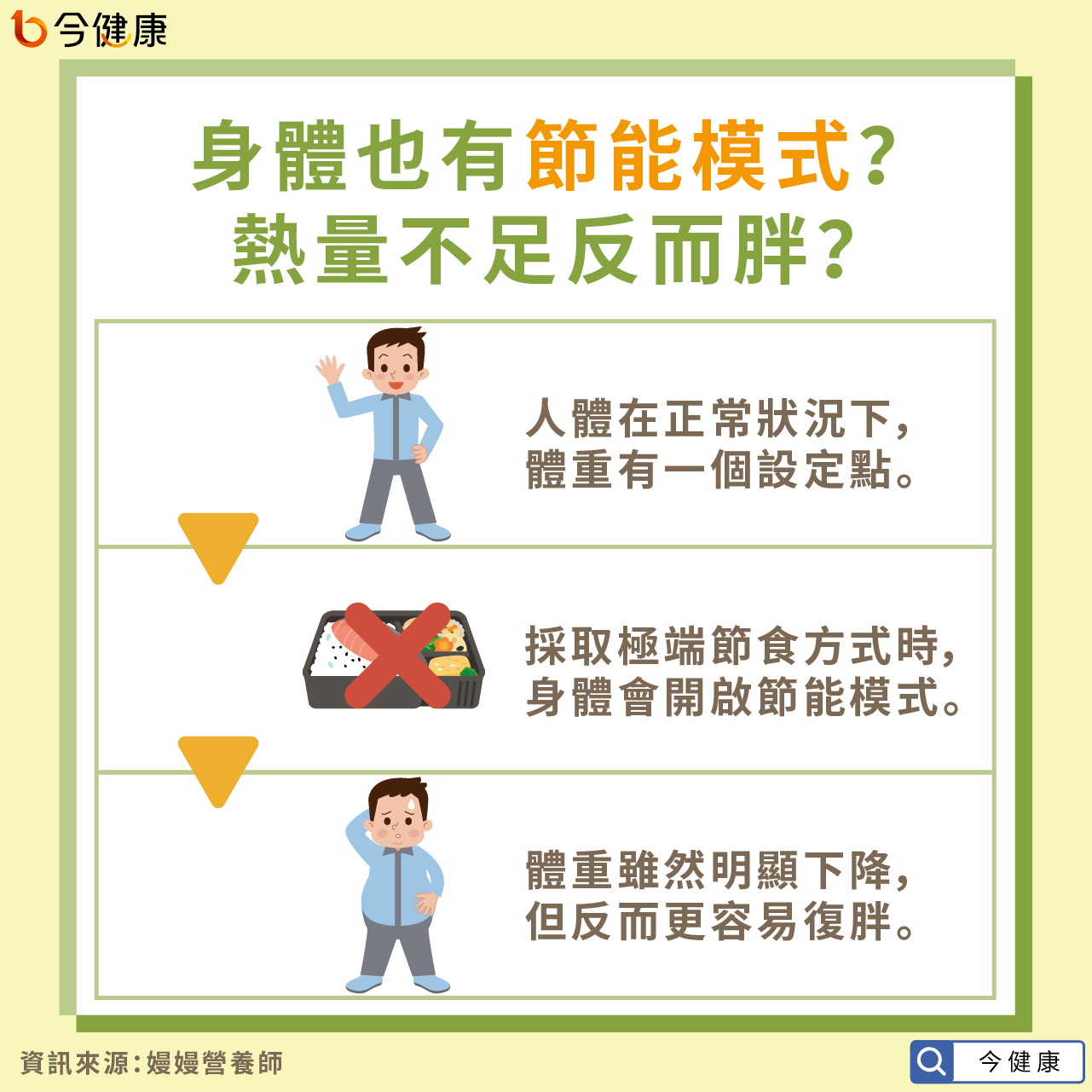 嫚嫚營養師說明,人體在正常狀況下,體重會有一個設定點,就像體溫和血壓一樣,為了讓人體能夠維持恆定,器官才能正常運作。採取極端的節食方式,例如一天一餐,熱量換算後,可能低於1200大卡,這麼少的情況,身體會出現防禦機制,將基礎代謝率下降,也就是「節能」模式。當身體長期處在節能模式,容易破壞體重的設定點,平均兩週的時間,平均代謝率就會下降15%,因此飲食恢復正常後,反而熱量容易超標,一旦時間拉長,體重雖然明顯下降,但也會伴隨肌肉流失,這兩種加起來就是標準的易胖體質。