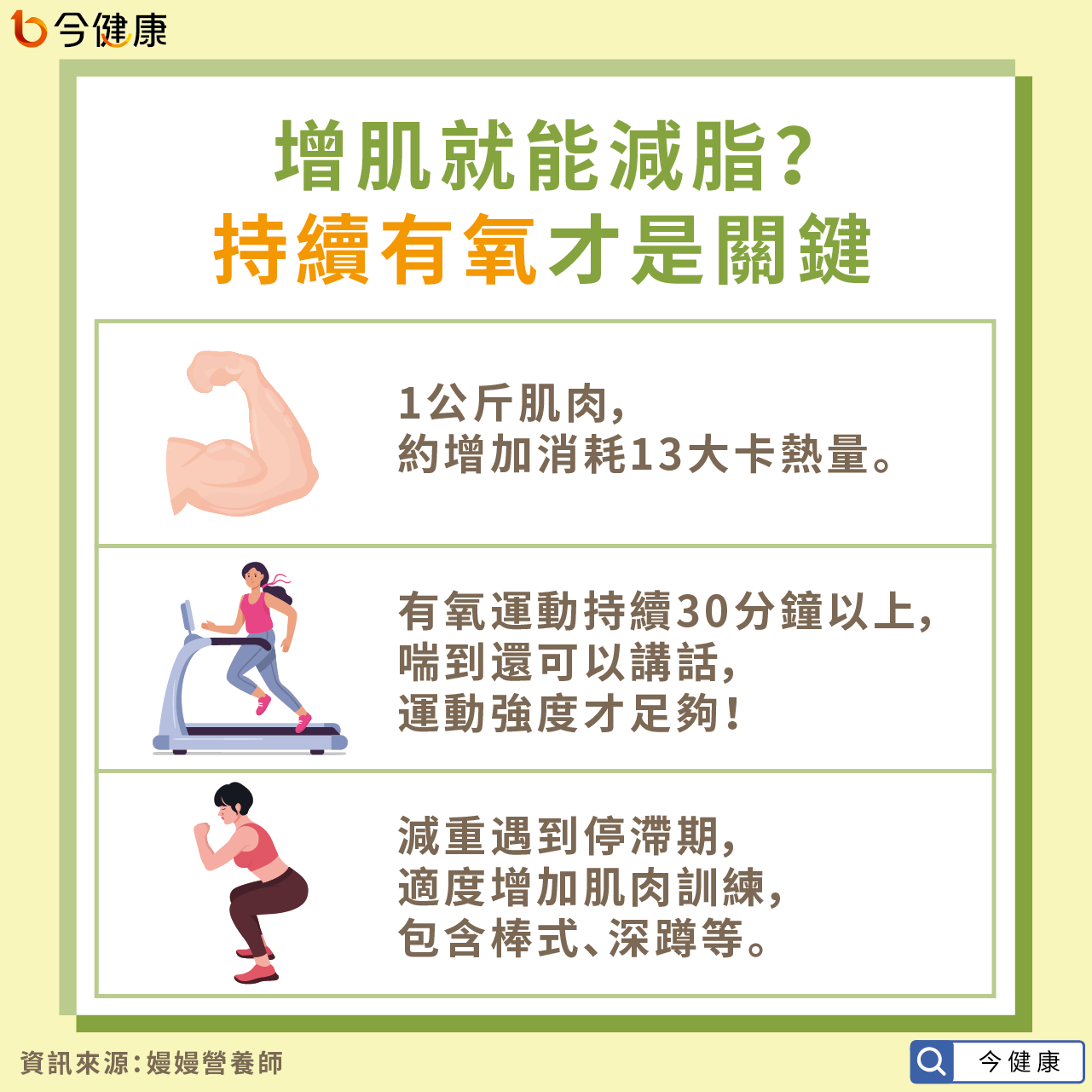 嫚嫚營養師指出,要想避免體脂上升,建議以飲食控制為主,切勿以為只要運動就能減重成功,1公斤的肌肉約增加消耗13大卡熱量,還是需要配合減脂和增肌運動。