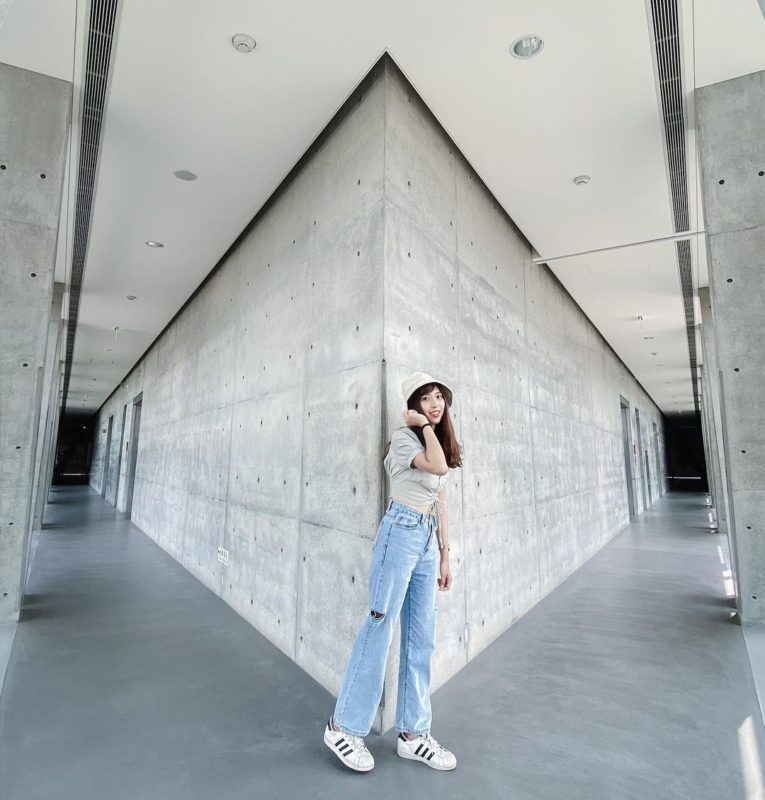 有別於一般直立式的柱子,亞洲大學現代美術館內的柱子全是歪的,以正三角形為元素,將正三角形的平面分割成3個樓層,再錯落堆疊成不規則的無數個三角形,並使用大量清水模和玻璃帷幕建造,採光明亮且每個光影變化都是那樣的迷人。