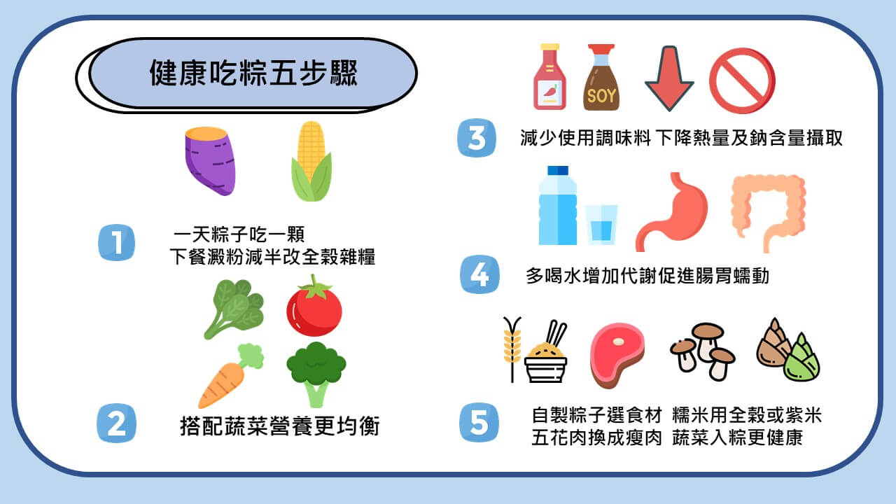 粽子一顆熱量約 600 大卡,佔了一天熱量的 1/3,不小心下一餐多吃熱量就破錶了!所以吃完粽子,下一餐的主食類建議減少,或者改食用地瓜、玉米等主食,也能增加纖維質跟維生素的攝取。 - 餐餐細嚼慢嚥,搭配蔬菜更健康