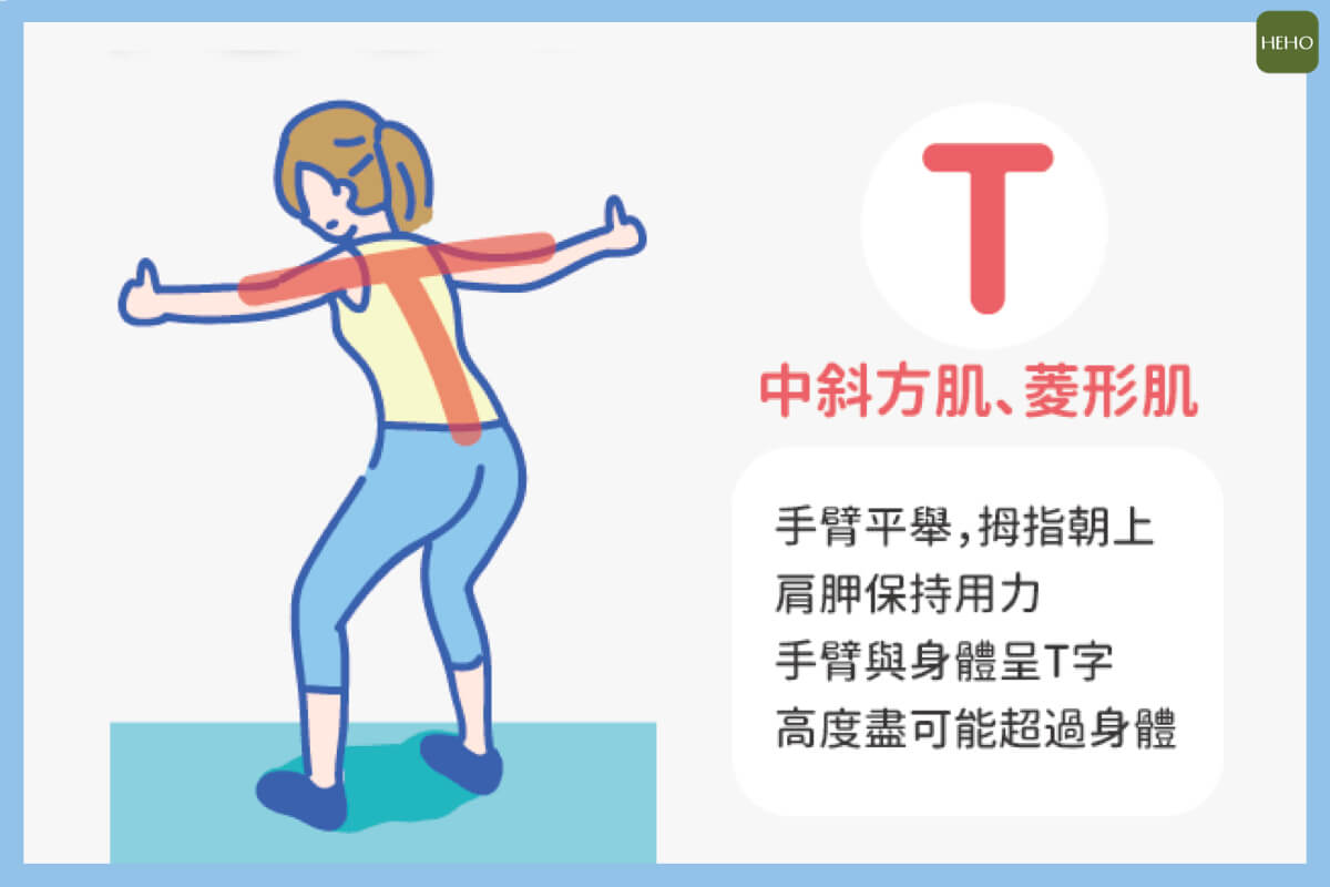 - 動作 T,鍛鍊肌肉為中斜方肌、菱形肌