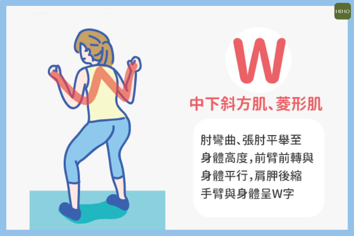 - 動作 W,鍛鍊肌肉為中下斜方肌、菱形肌