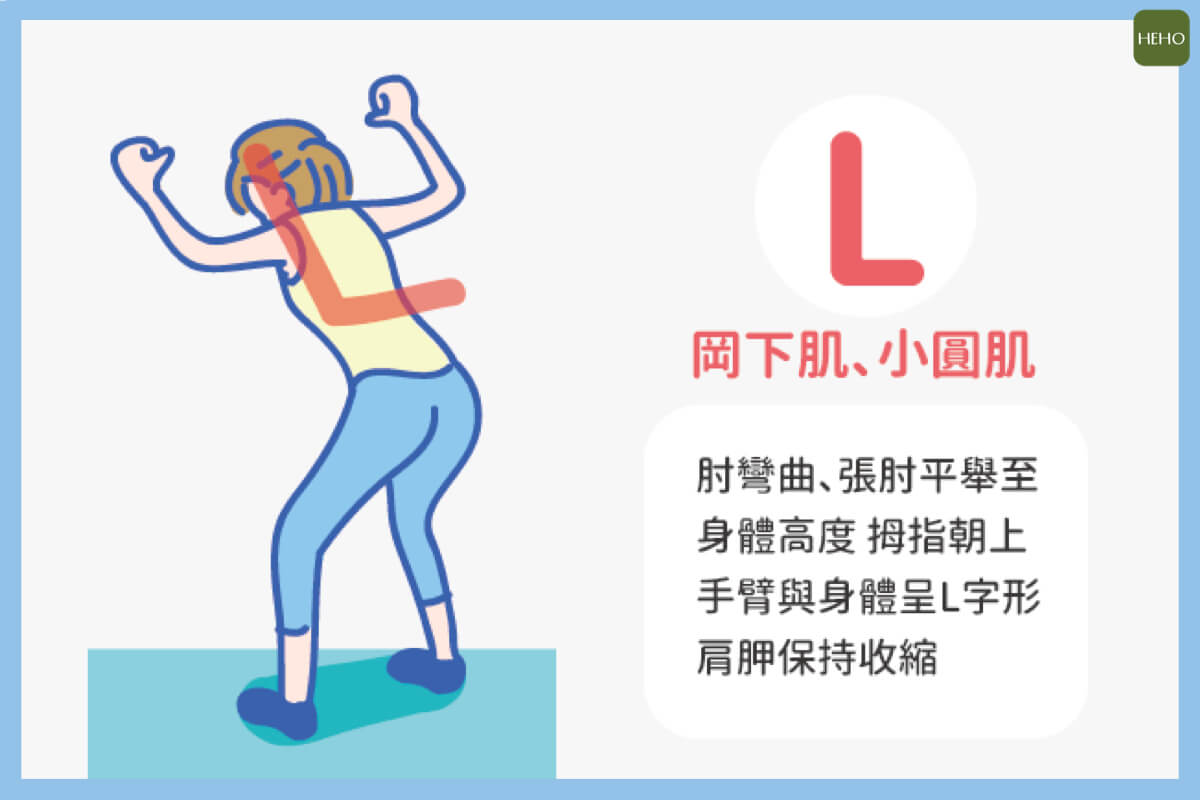 - 動作 L,鍛練肌肉:岡下肌、小圓肌