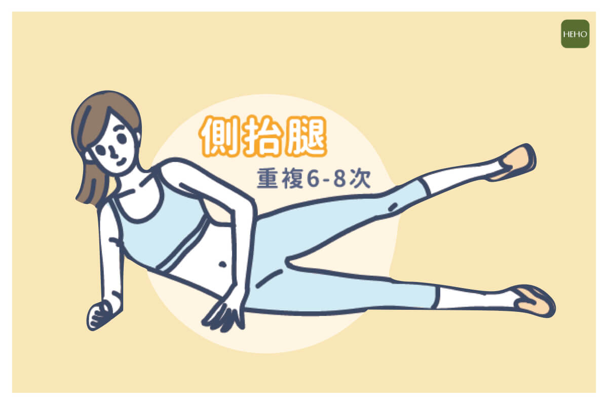- 將肚子收緊,慢慢向上抬起左腿,停留 5-10 秒後再緩慢放下腳