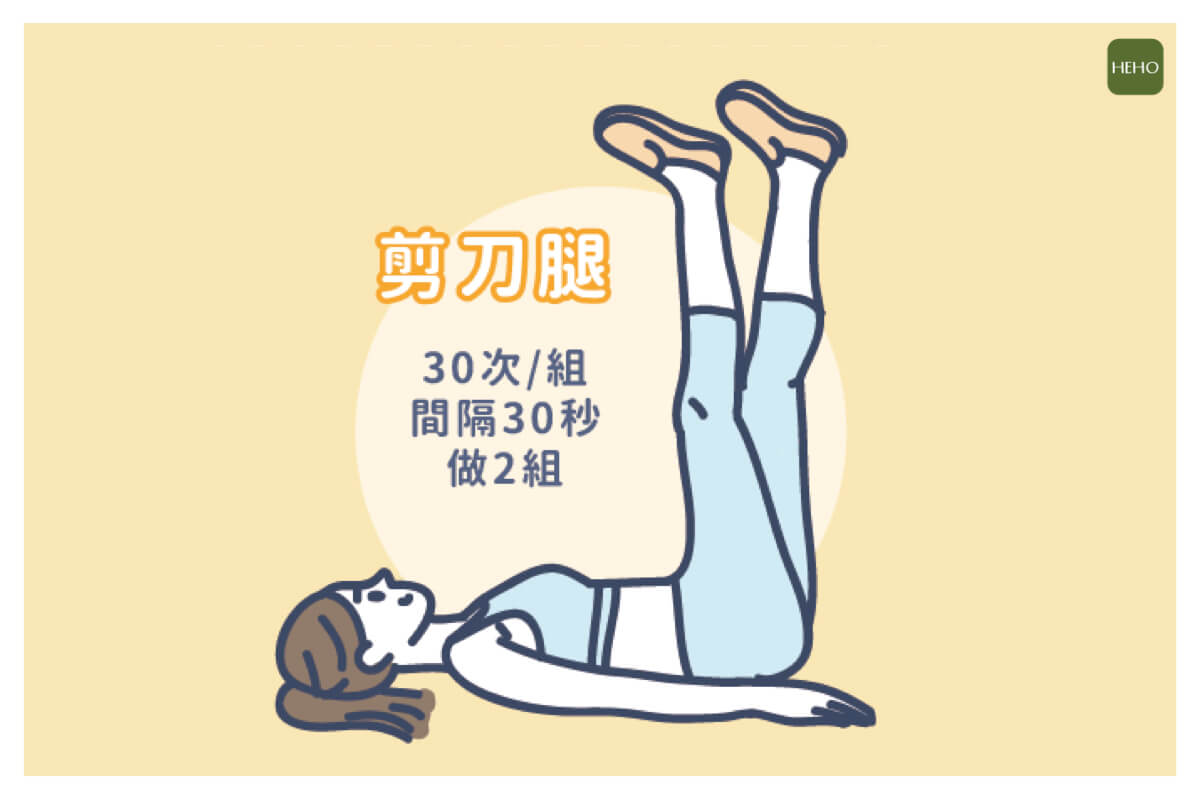 - 動作開始時將雙腿伸直互相交叉開闔,像剪刀一樣左右交錯擺動,速度不用很快。(注意動作時,肩膀和背部要平貼在地面。 )