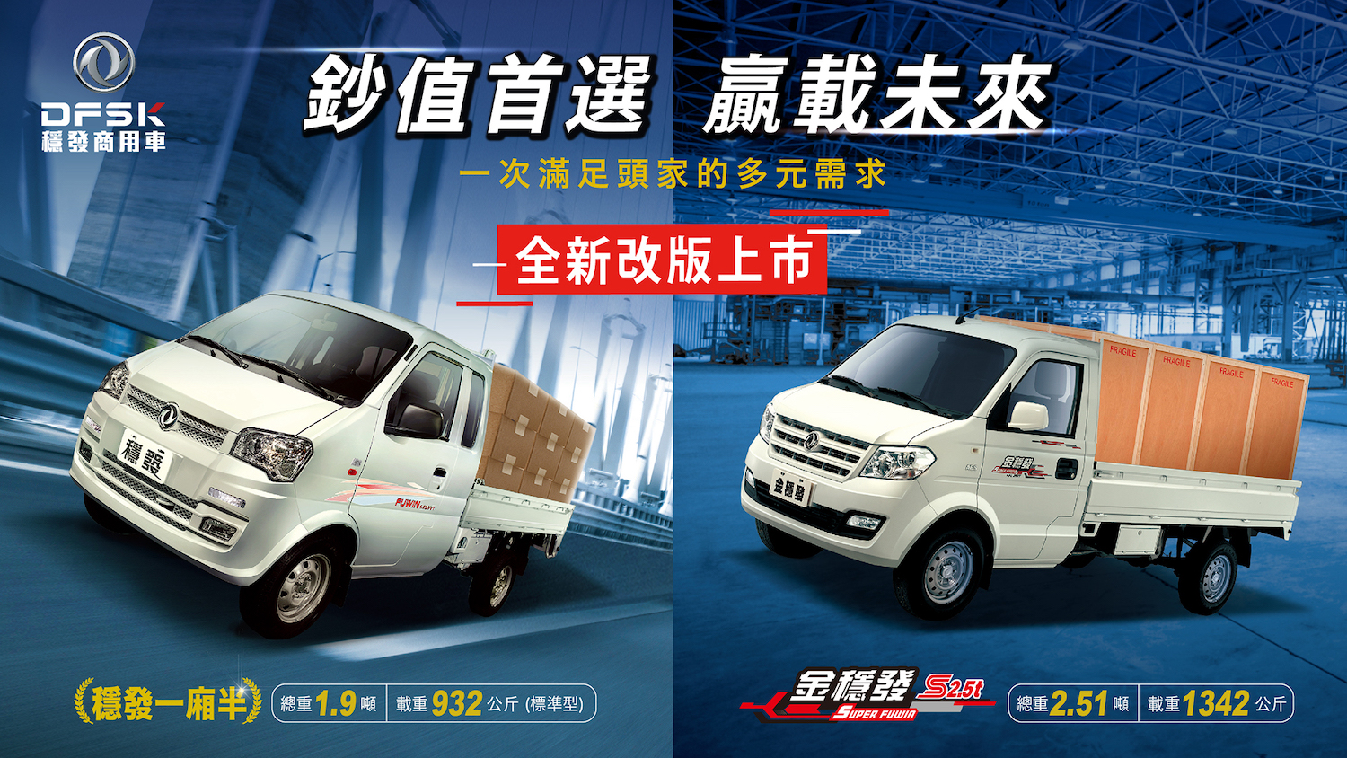DFSK 穩發商用車在國內上市超過 5 個年頭,持續導入了金穩發單廂、大穩發 S2.5t 雙廂及穩發一廂半共 3 款多元產品。今日隆重推出金穩發 S2.5t,載重、動力、配備全面升級,而穩發一廂半則改款為歐六排放標準更乾淨。