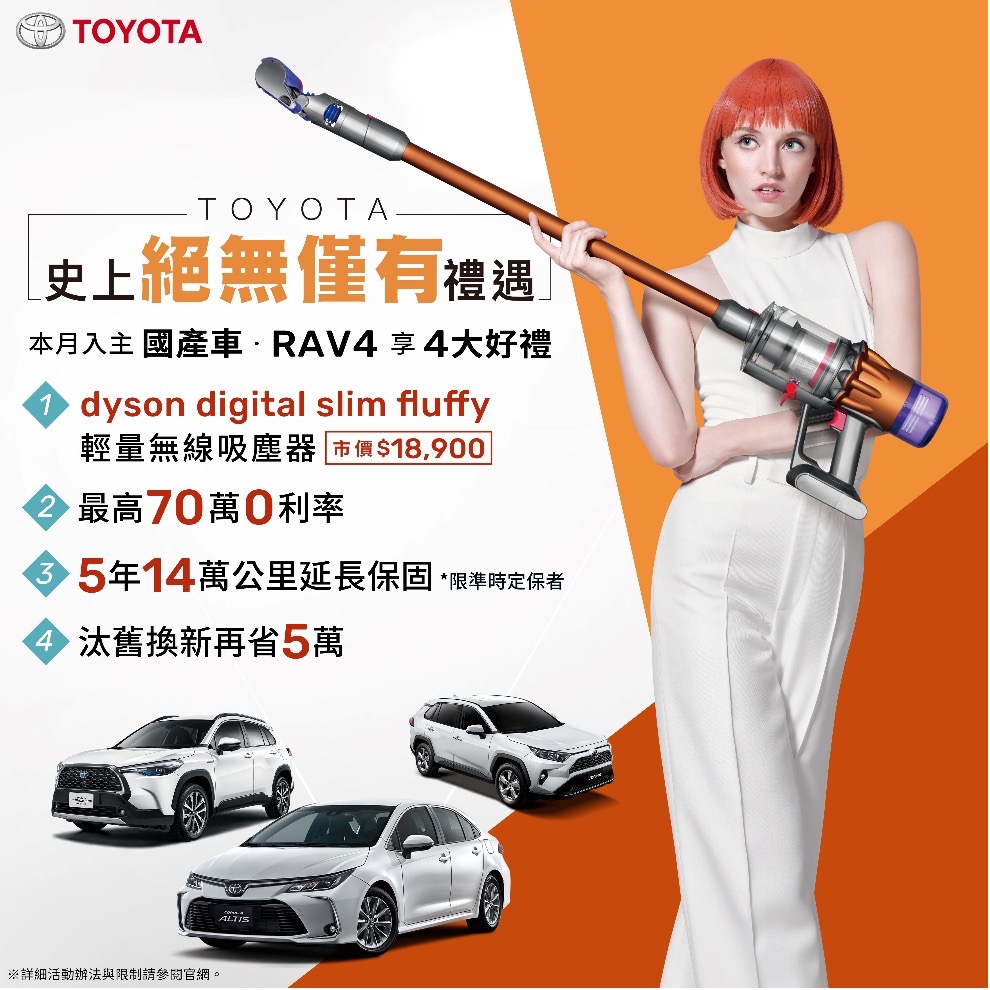 「TOYOTA史上絕無僅有禮遇」活動,凡入主國產車、RAV4 就送 dyson 輕量無線吸塵器(dyson digital slim fluffy,市價新台幣 18,900 元),再享最高 70 萬 0 利率優惠,準時定保可享 5 年 14 萬公里延長保固,以及政府補助汰舊換新再省 5 萬等四大好禮。其中,本次交車禮「dyson輕量無線吸塵器」為 dyson 全新機種,重量僅 1.9 公斤,搭載先進專利 dyson 馬達發揮強勁吸力,五重過濾系統可達到深層除蟎。