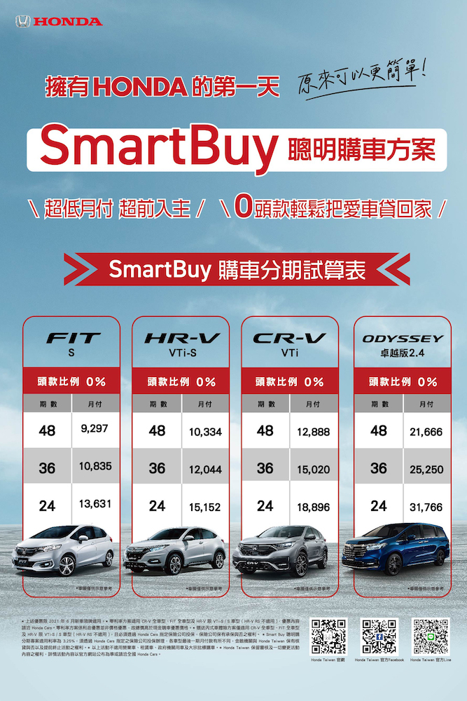 此外,為了減輕消費者購車負擔,Honda Taiwan 特別規劃「SmartBuy 聰明購車方案」,以超低月付、超前入主、0 頭款輕鬆把愛車貸回家。