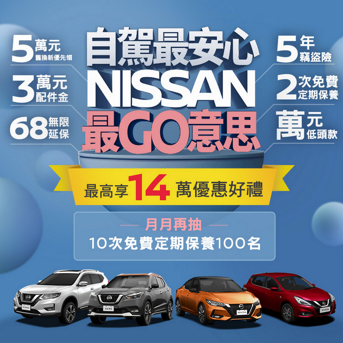 因應近日國內 COVID-19 疫情升溫,裕隆日產汽車為滿足消費者「安心自駕」移動需求,自即日起至 7 月 30 日止,限時推出「NISSAN GO 意思」購車優惠專案,凡於期間內入主 NISSAN 國產全車系,即可享有最高總價值 14 萬元最GO意思8大安心好禮,活動期間再加碼月月抽 100 名 10 次免費原廠定期保養,最高價值約 38,000 元。