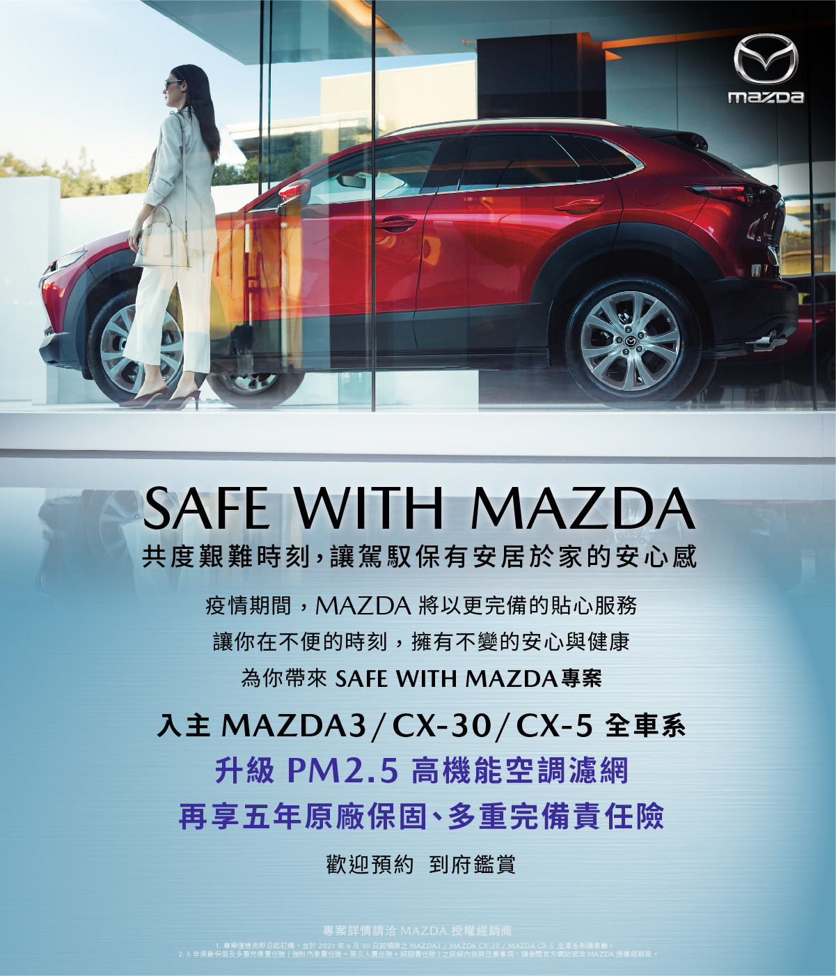 台灣馬自達本月推出「SAFE WITH MAZDA專案」,全車系升級「PM2.5高機能空調濾網」,可有效過濾 PM2.5 並防堵外在病毒,抗菌、防霉、除臭與維持穩定風量;購買 MAZDA3、CX-30、CX-5 車系即贈「5 年原廠保固」,再享「贈送首年多項責任險(強制汽車責任險、第三人責任險、超額責任險)」或「24 期高額 0 利率」優惠二選一;另外,本月入主 MAZDA2、MAZDA6、CX-3、CX-9 可選擇享有「5 年原廠保固」或「24 期高額 0 利率」。「SAFE WITH MAZDA 專案」。