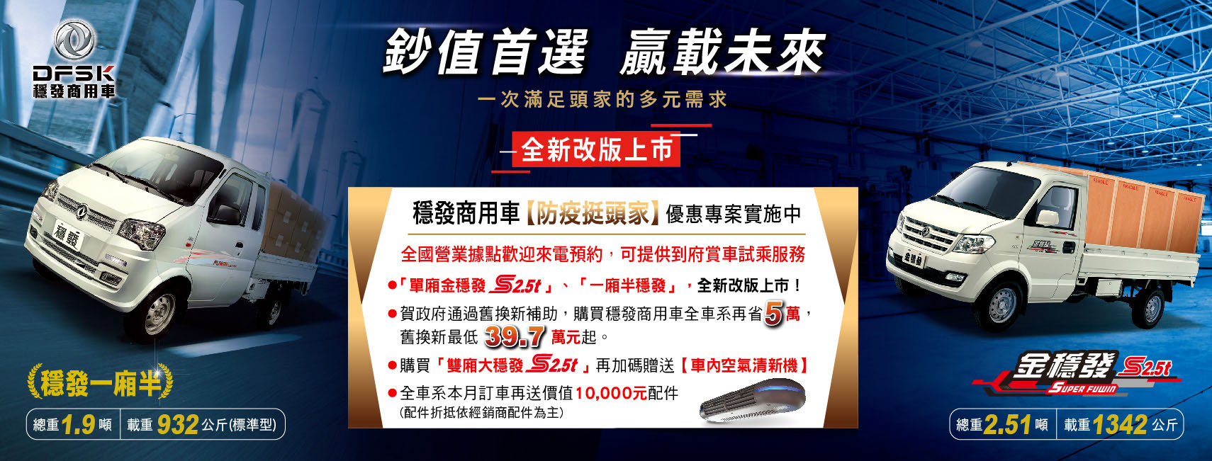 DFSK 穩發商用車一次帶來兩款升級小貨車,金穩發 S2.5t 載重與動力均領先同級貨車,改款後更能載也更有力,便利配備也升級,不到 50 萬即可入主;穩發一廂半升級歐六排放更乾淨,安全與配備大幅提昇,1.2 升引擎更是省油省稅,提供長、短兩種鐵床選擇,現正推出「防疫挺頭家」優惠專案,購買穩發商用車全車系,舊換新再省 5 萬,最低 39.7 萬元起;購買雙廂大穩發 S2.5t 加碼贈送「車內空氣清新機」;全車系本月訂車再送價值 10,000 元配件(配件折抵依經銷商配件為主。)