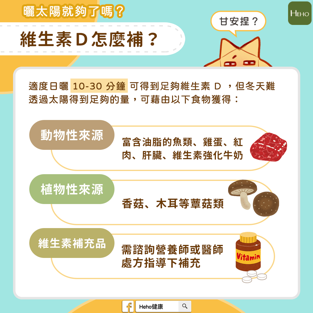 - 維生素 D 的來源:日照、魚類、雞蛋、牛奶、黑木耳、乾香菇