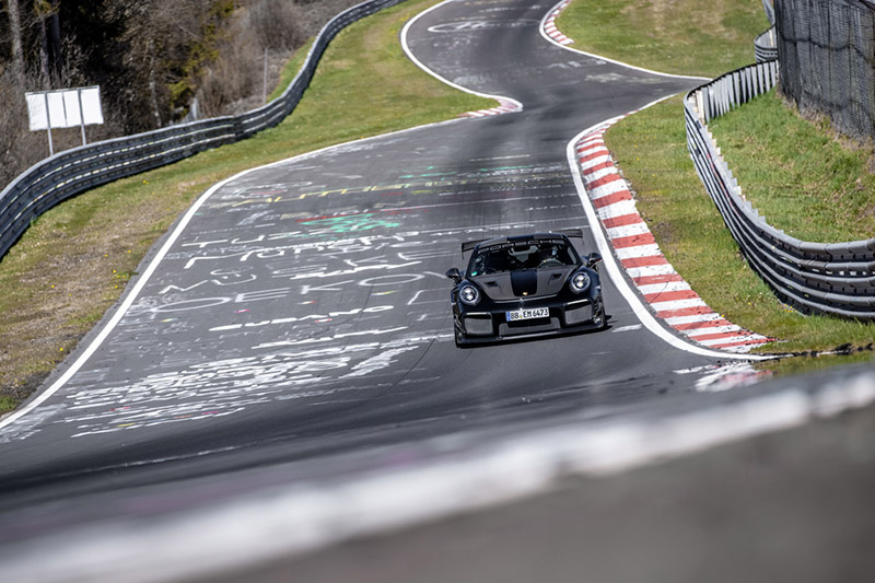 在此之前,911 GT2 RS也曾是紀錄保持者,在此之前,紀錄一度被Mercedes-AMG GT Black Series佔據,但Porsche再次擁有其51%股權、公司就位於Nürburgring Meuspath的Manthey-Racing賽車公司合作,配上專屬套件,由Porsche開發車手Lars Kern操刀駕駛,並配置米其林Pilot Sport Cup 2 R,即便賽道溫度達攝氏41度,Manthey Performance Kit專屬套件仍讓車輛如膠水般服貼在賽道上,最後以6分43秒300單圈成績打破原本6分48秒047的紀錄,比原紀錄快了4.747秒。
