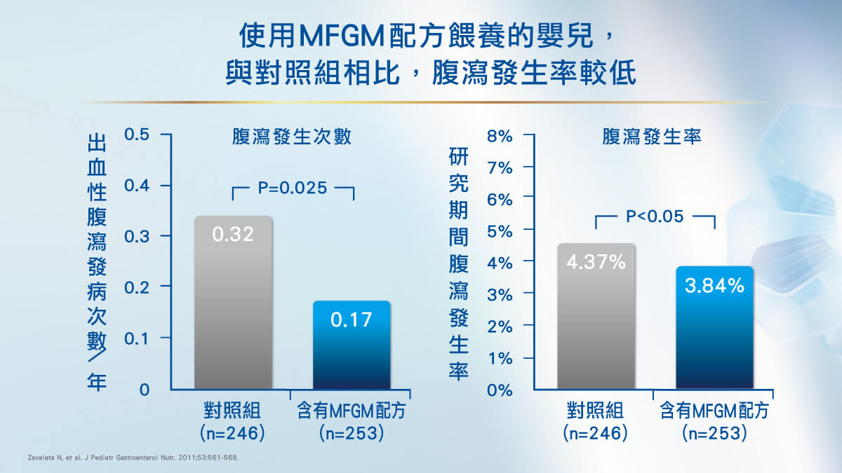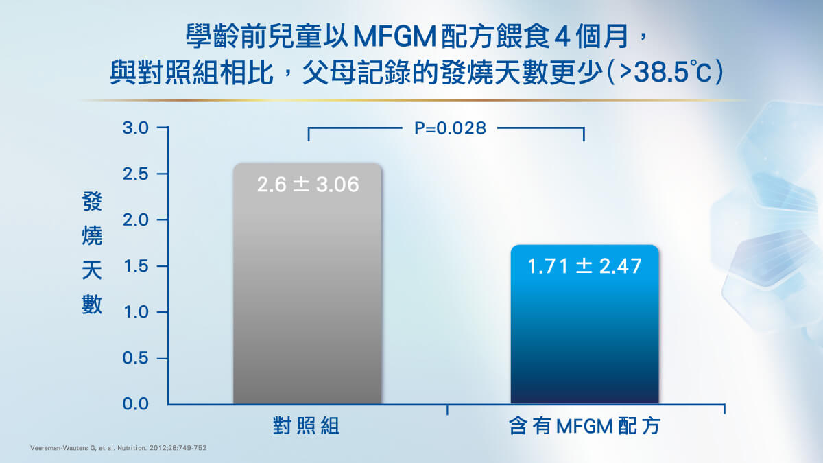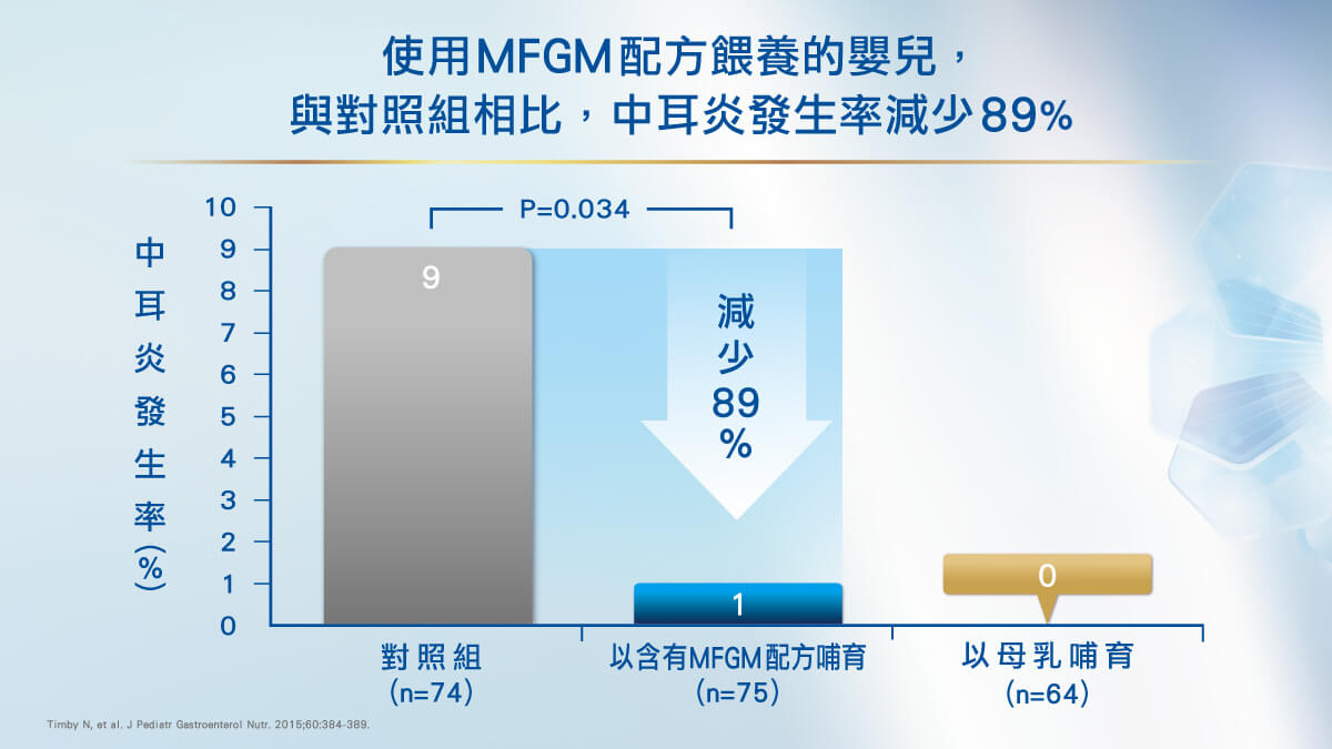 莊佳韻說,根據臨床研究顯示,使用含 MFGM 乳脂球膜配方的寶寶,相較於使用不含 MFGM 乳脂球膜配方者,寶寶中耳炎發生率、腹瀉發生率、與發燒天數都較低。