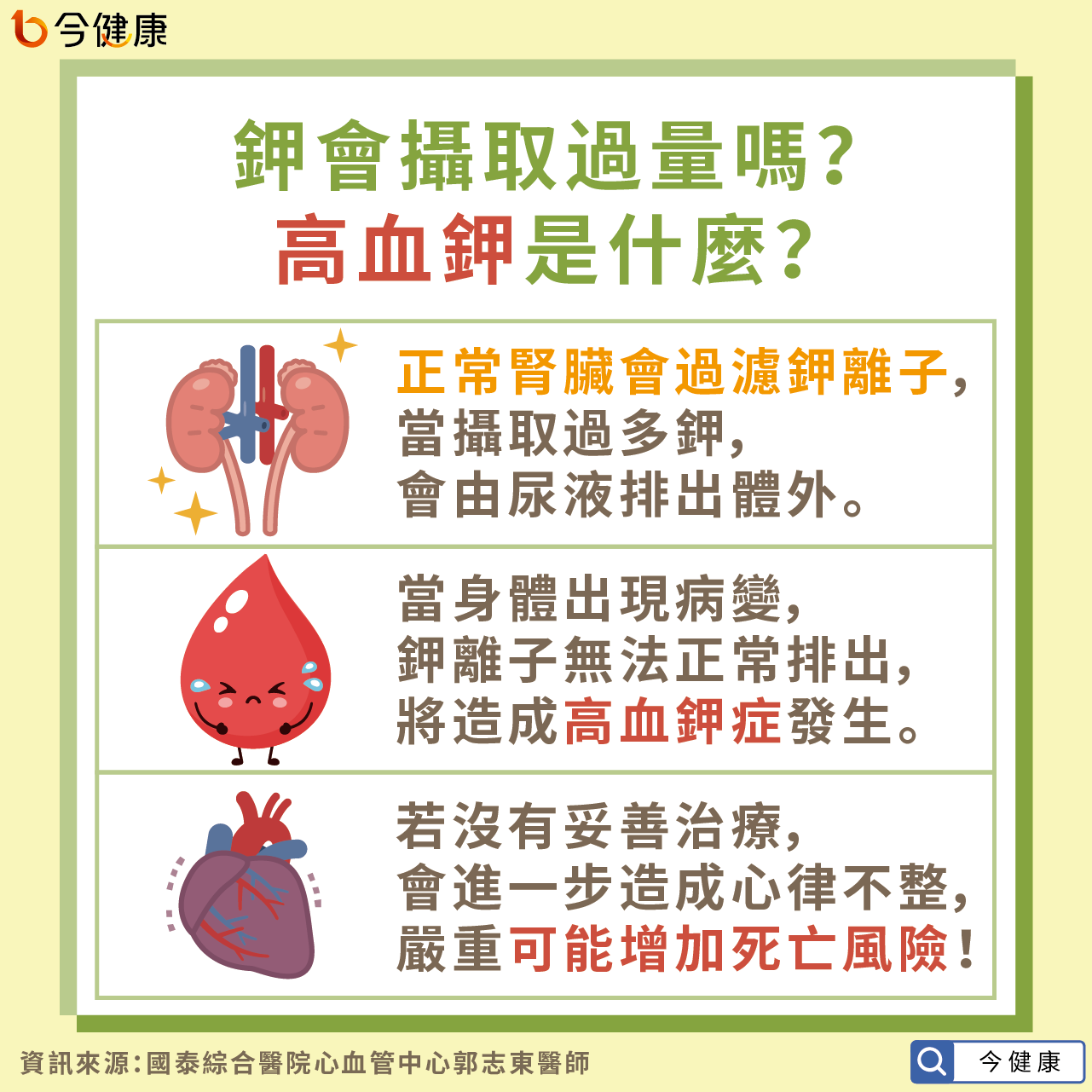 正常人的腎臟會過濾從飲食或其他方式,如藥物攝取過多的鉀離子,一般會通過尿液排出身體,當身體出現病變無法排出鉀離子時,則會導致血液中鉀含量過高,也就是「高血鉀症」發生,若沒有妥善治療,會進一步造成心律不整,嚴重可能導致心臟病發作或增加死亡風險。