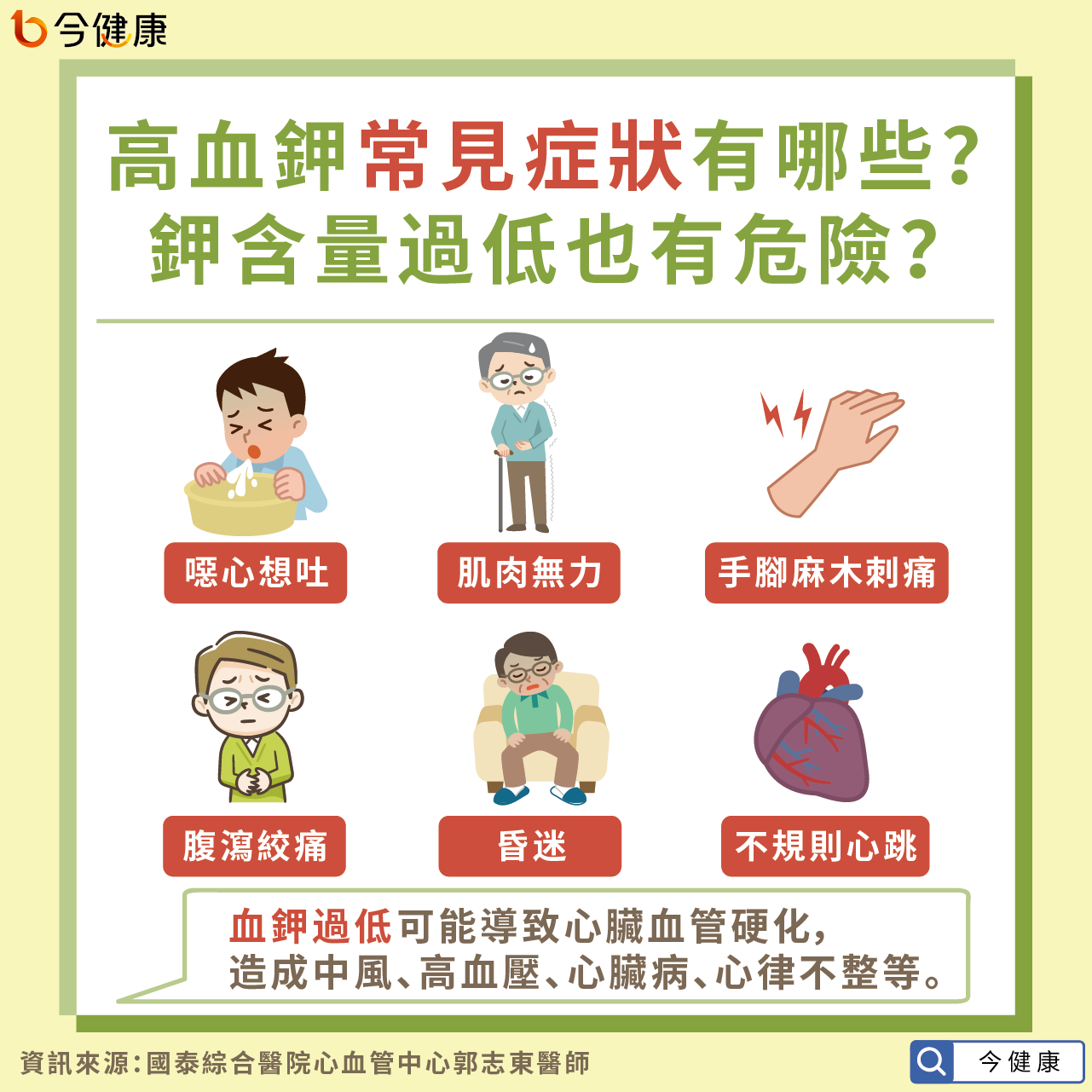 郭志東醫師指出,高血鉀症常見症狀包含,噁心想吐、肌肉無力、手腳麻木或刺痛、腹瀉、腹部絞痛、昏倒、不規則心跳等,雖然高血鉀有許多不良影響,但如果血中鉀離子過低也會有很多不良後果,低血鉀水平可能會導致心臟血管硬化,造成中風、高血壓、冠狀動脈心臟病,也有可能產生心律不整。