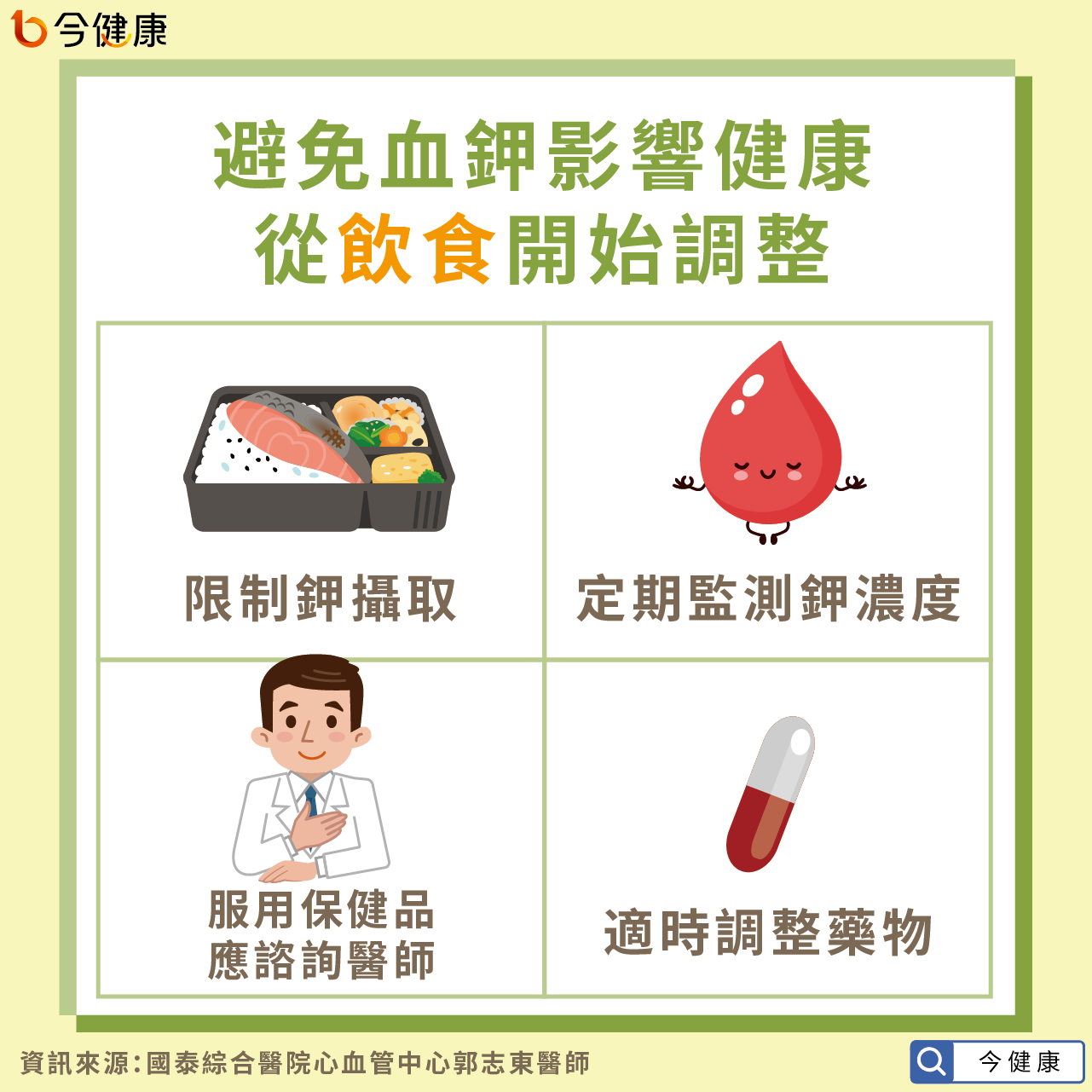 郭志東醫師表示,保持血液鉀水平在健康範圍,是避免心臟相關併發症的關鍵,目前治療方式包含低鉀飲食、利尿劑、鉀結合劑或使用一些能結合腸內過量鉀離子的藥物,並在大便時將其排出。不過,血鉀治療後依然過高,進而影響心跳或節律時,則需使用血液透析過濾血液中過量的鉀離子。