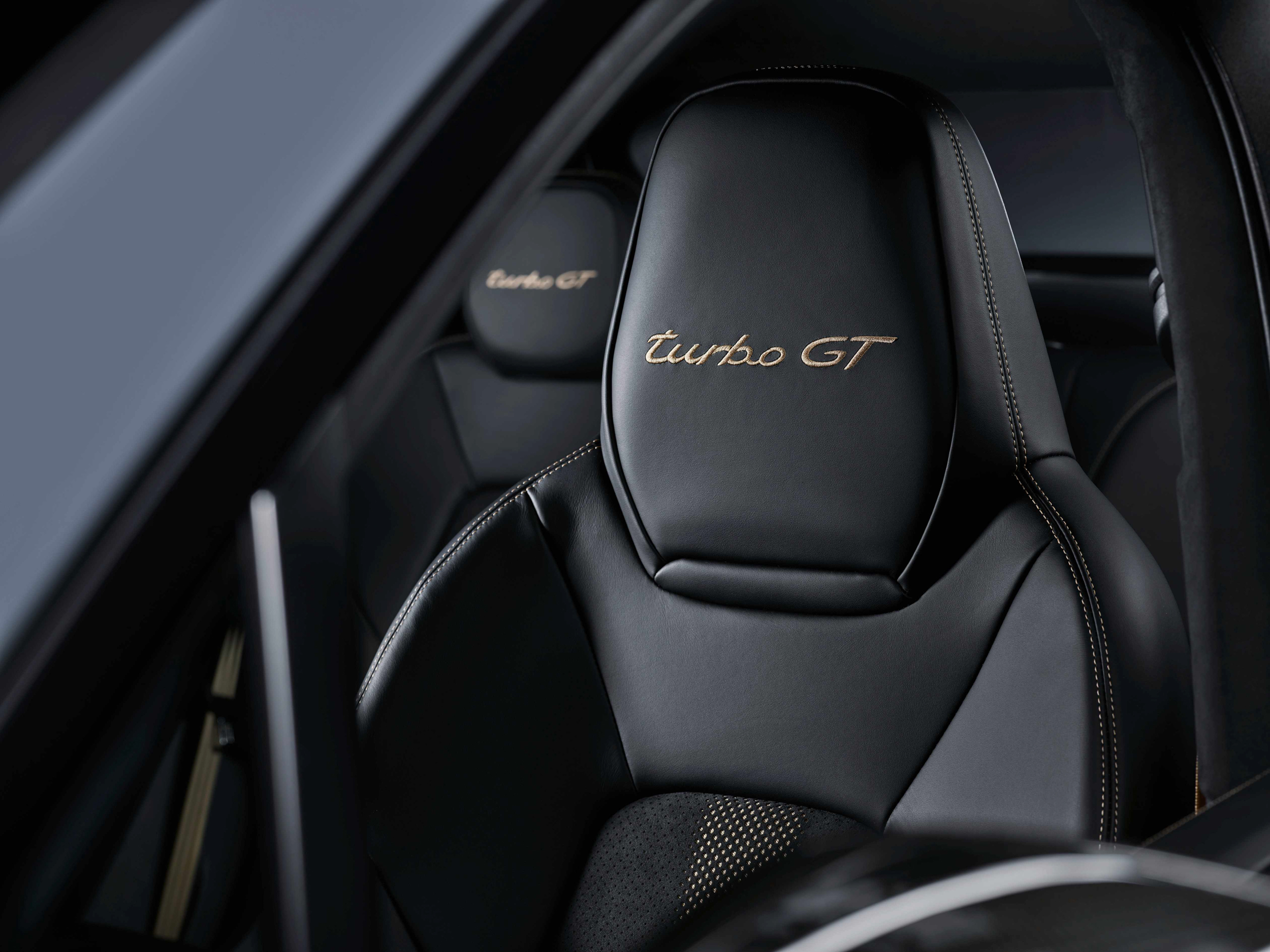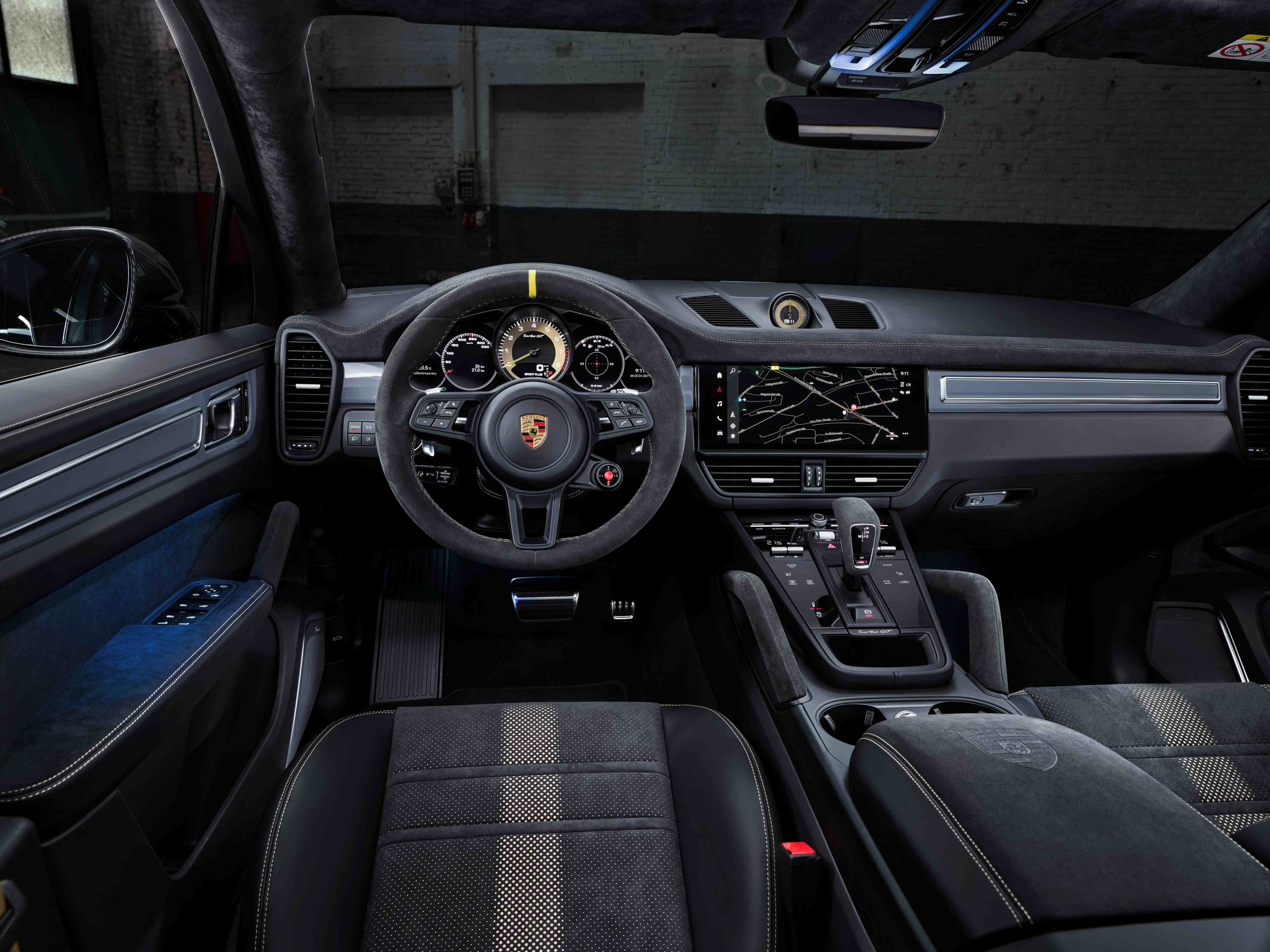Cayenne Turbo GT 的運動化風格全面體現於其高水準的標配清單中,和以 Alcantara 麂皮為主要材質延伸的內裝。雙前座八向電動調整跑車座椅以及跑車化雙後座系統為標配,座椅皆採 GT 專屬設計,中央椅面採用 Alcantara 麂皮包覆,頭枕施以 turbo GT 字樣,釹銀或冰極灰色更襯運動氣息。標準配備承襲保時捷跑車的多功能跑車式方向盤,鑲嵌霧面黑色方向盤輻,含 12 點鐘方向施以競速黃色標記。
