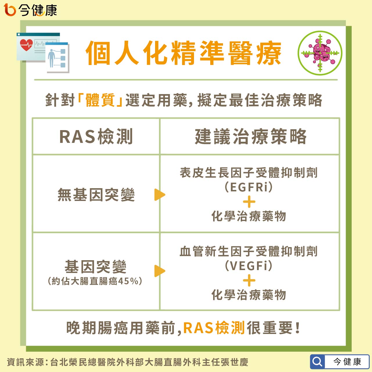 張世慶主任指出,在大腸直腸癌患者當中,約莫45%可檢出RAS基因突變。「有RAS基因突變者,原則上使用表皮生長因子受體抑制劑 (EGFRi)的標靶藥物效果不彰,所以一旦驗出突變、就只能選擇抗血管新生的藥物。」「根據目前大型臨床試驗的結果發現對沒有RAS突變的病人,通常使用表皮生長因子受體抑制劑 (EGFRi)加上化學治療藥物,反應率可以達到約7成,若是使用血管新生因子受體抑制劑 (VEGFi)加上化學治療藥物,反應率為6成左右。」