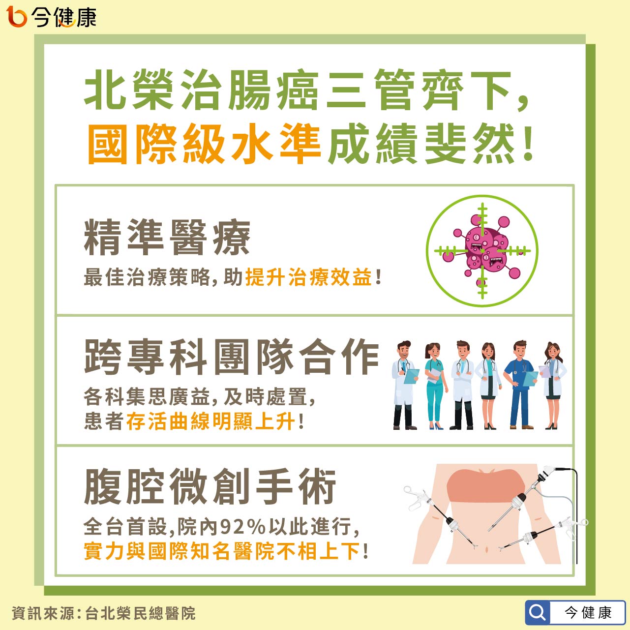 晚期轉移性大腸癌治療以化學藥物與標靶藥物為主,擬定治療策略時,除了考慮病人體能、癌症形態等因素,由於腸癌細胞特定基因突變會影響藥物治療反應,用藥前先檢查相關標記,為患者擬定最佳化治療策略,也是北榮治療常規。