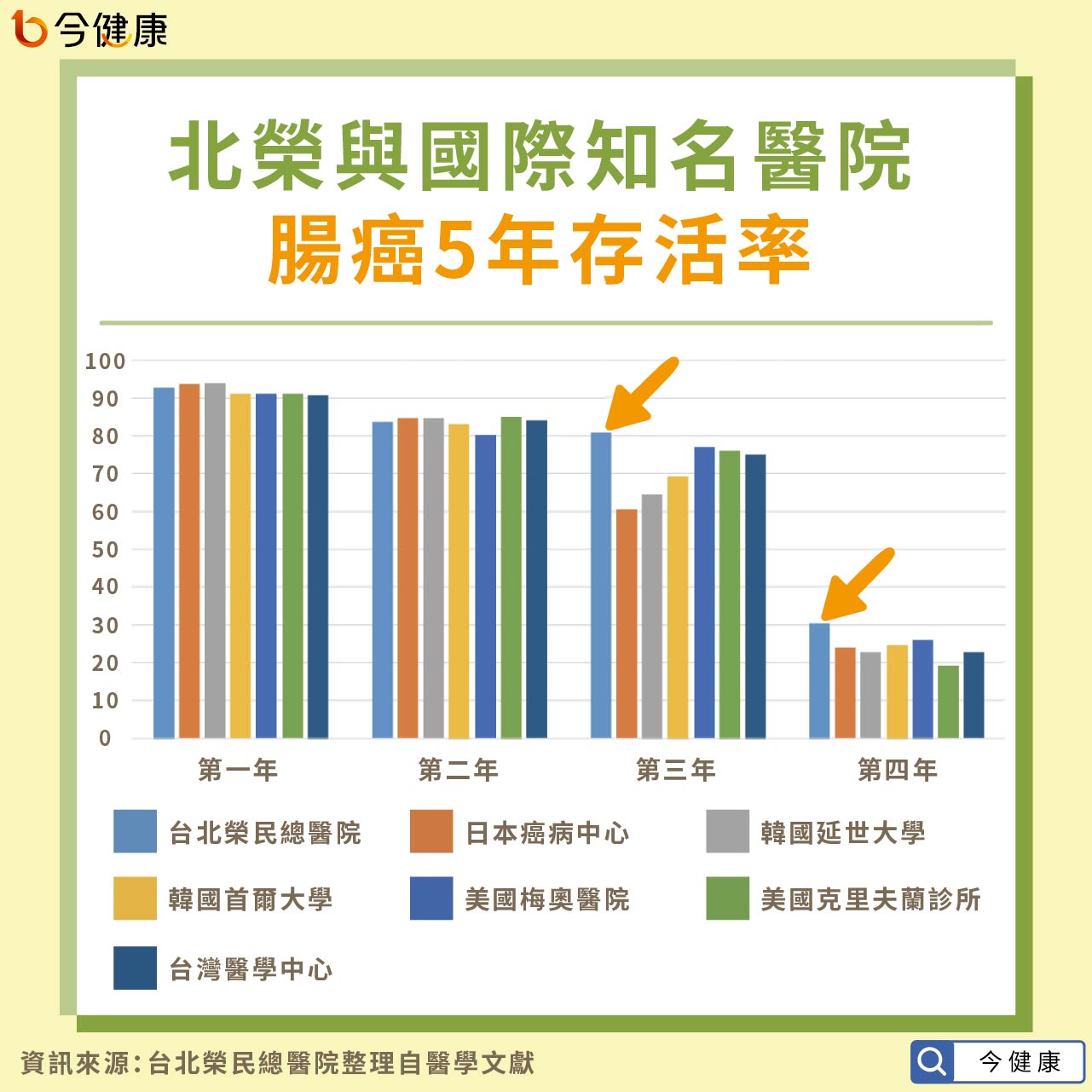 台北榮民總醫院一年收治超過七百名新診斷大腸癌病患,不只大腸癌手術量居全台第一,近年治療成果數據顯示,與克里夫蘭診所、韓國延世醫院等國際知名醫院相較也毫不遜色。