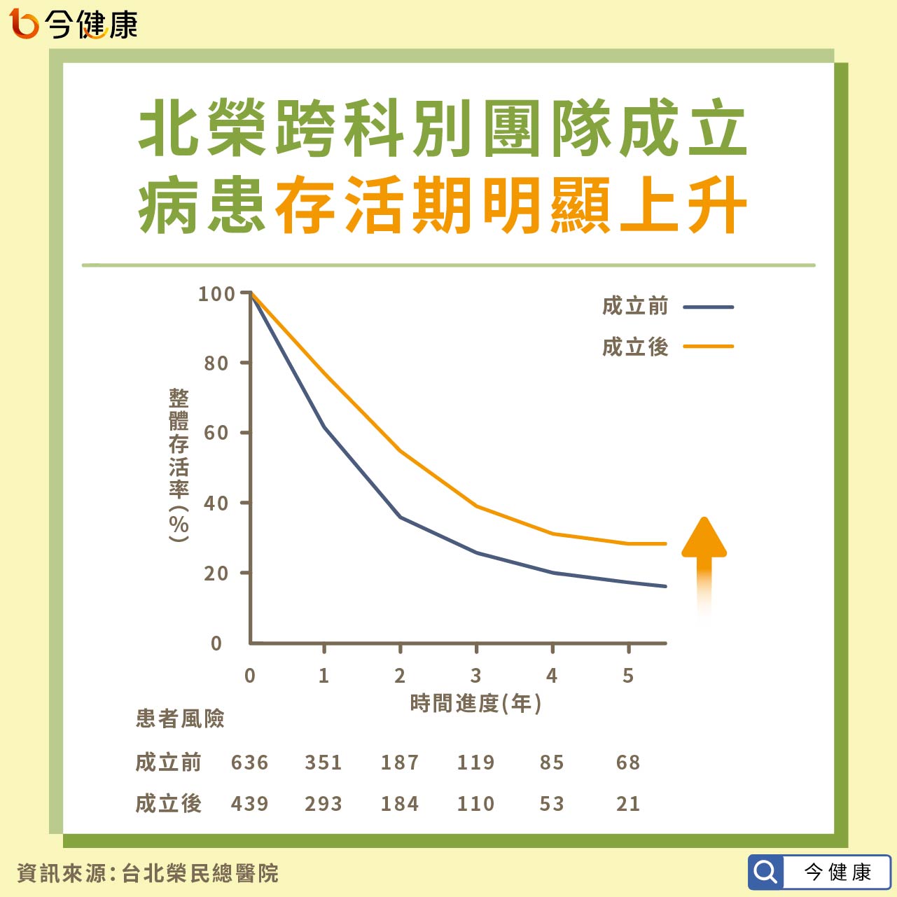 黃聖捷醫師指出,北榮成立多專科團隊之後,長期追蹤統計顯示,患者存活曲線明顯上升。除了成立多專科團隊,台北榮總團隊也是全台灣第一個開始做腹腔微創手術,到現在約莫92%的大腸直腸都是用微創手術進行,團隊治療成果不管是手術死亡率、直腸癌腫瘤復發比率、五年存活率等,與國際知名醫院像是克里夫蘭診所、韓國延世醫院等相較毫不遜色,甚至在第三期、第四期的治療成效還優於日韓知名的醫學中心。