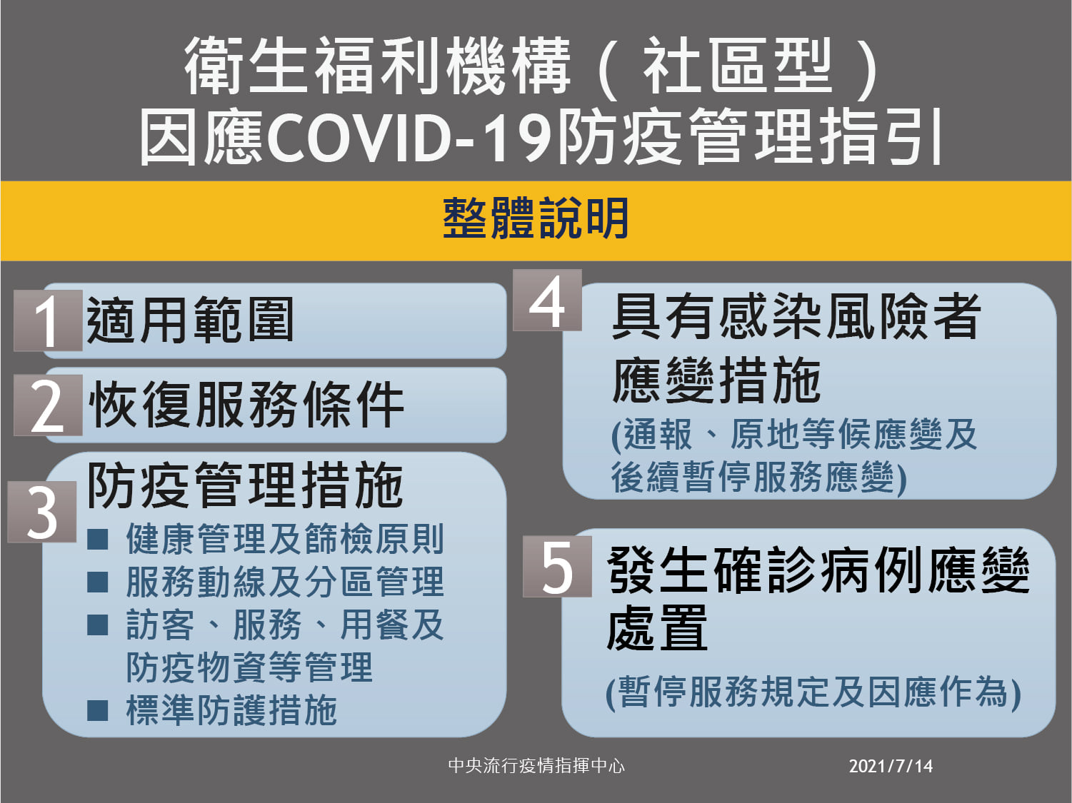 指揮中心說明,為確保服務對象健康,衛生福利部特訂定「衛生福利機構(社區型)因應COVID-19防疫管理指引」,針對「服務條件」、「自主防疫管理措施」、「具有COVID-19感染風險者之應變措施及發生確診病例應變處置」等管理事項,提供社區式服務機構依循辦理,地方政府應輔導轄內機構依本指引提供服務,並填具檢核表報地方政府備查,在完備防疫工作的前提下逐步恢復提供服務。