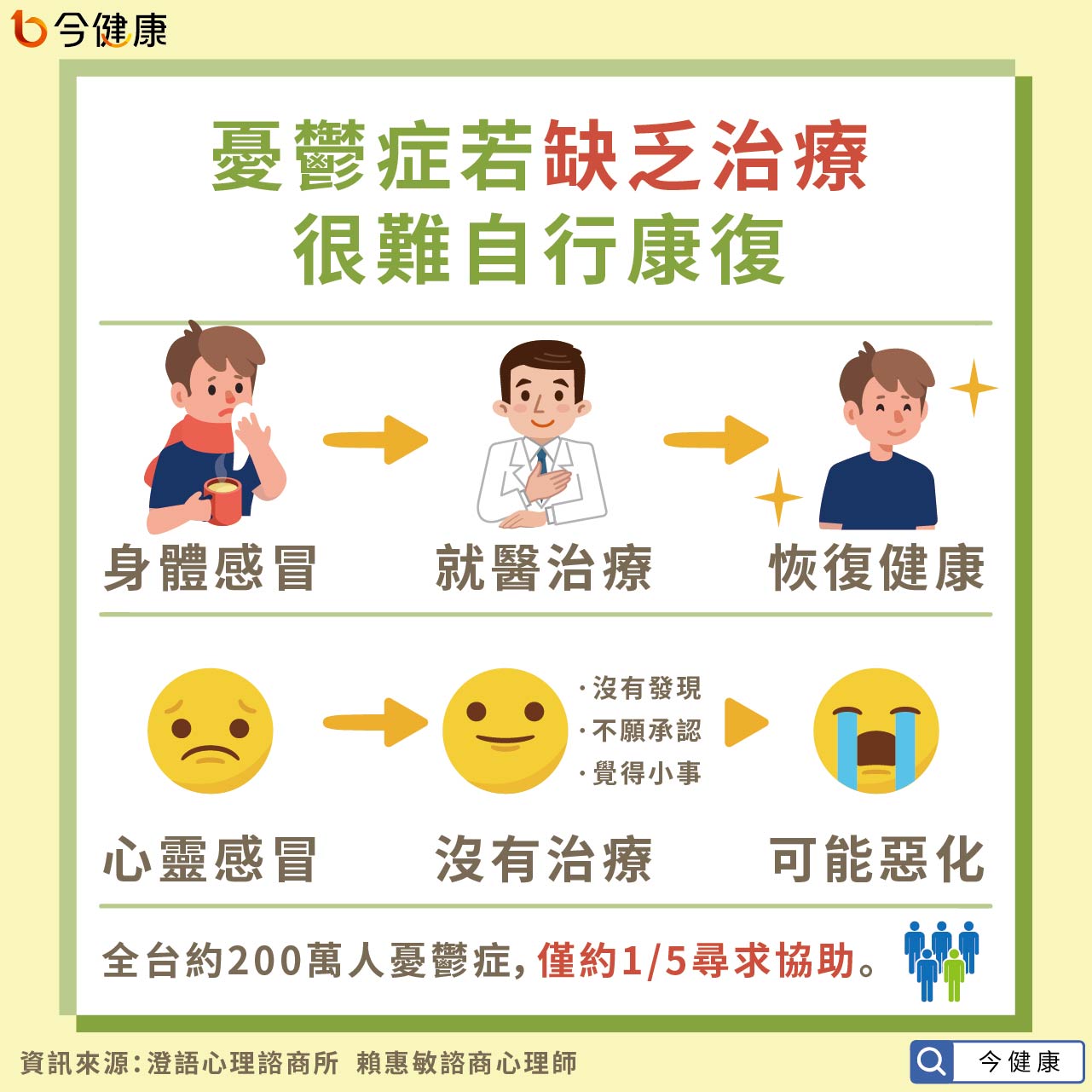 值得注意的是,憂鬱症如此普遍,根據衛生福利部的推估,全台約有200萬人罹患憂鬱症,但在台灣許多人不願承認自己有憂鬱症,也抗拒治療。只有五分之一的憂鬱症患者有去求助,還有五分之四沒有求任何治療。因此當我們周遭親友向我們求援時,千萬正視與尊重對方的求助訊號,避免憾事發生。