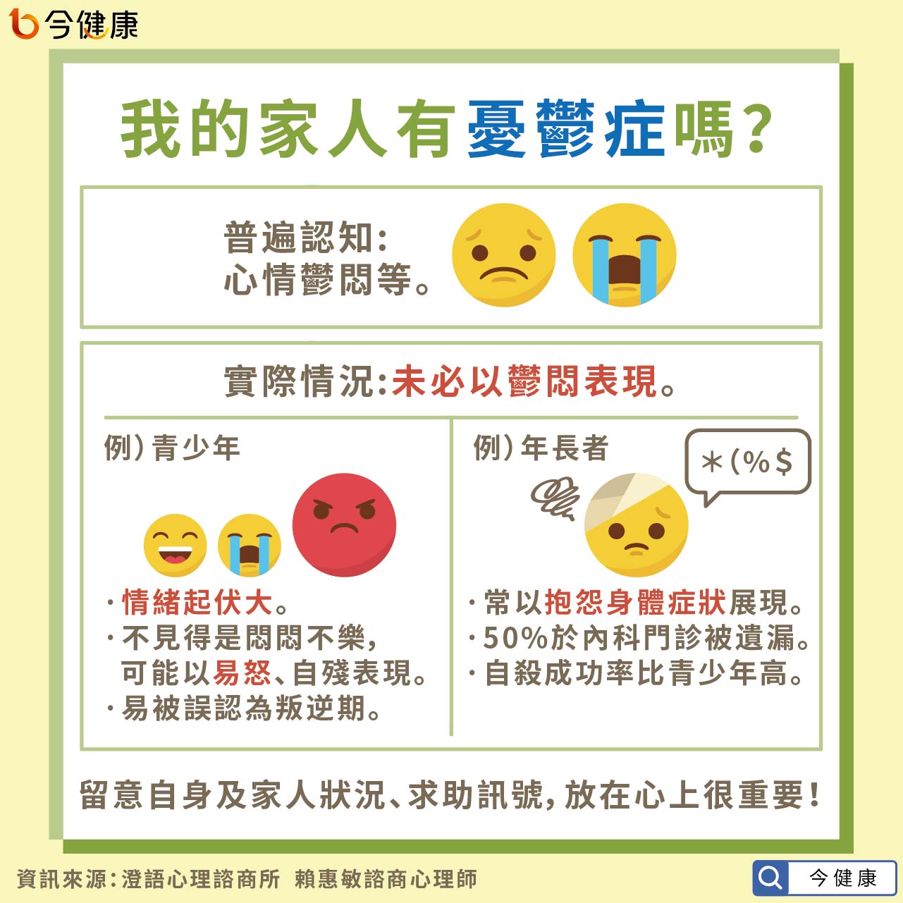 因此,如何關心、陪伴家人以及留意徵兆是重要的,如您目前正有家人或自己受到憂鬱症的困擾,請務必持續就醫以及搭配心理諮商的治療,維護心理健康。