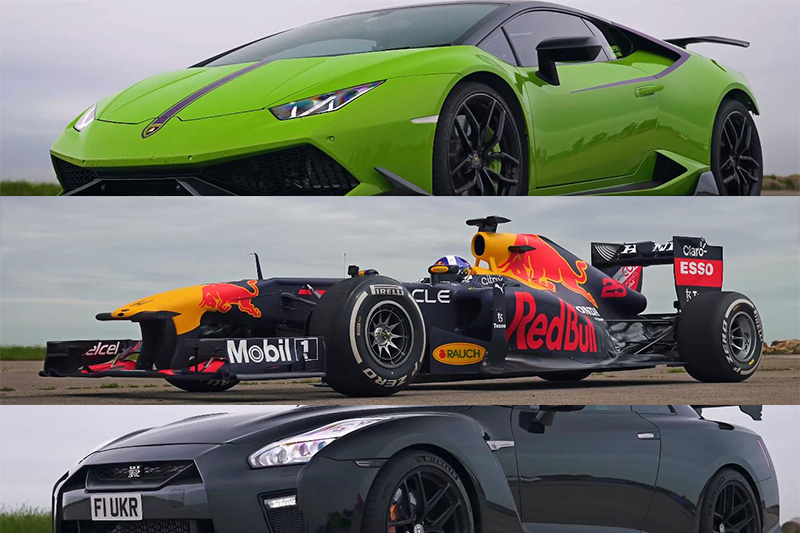 F1是賽車最高級別,除了在賽場上與對手相互競爭爭奪勝利,F1的性能實力也受到不少市售車想要挑戰證實自身實力,對此外媒便安排Red Bull RB7 F1賽車與Lamborghini Huracan和Nissan GT-R進行一場直線加速比賽。