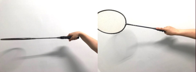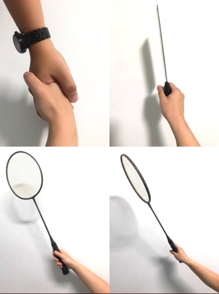 因此,在球拍運動的握拍姿勢就十分重要,以羽毛球握拍為例,正確的握拍方式(圖2)就像我們要握手或握菜刀一樣,虎口和球拍框的內側成一直線,手掌小魚際肌在準備揮拍時靠在球拍握把,揮拍時可用小肌肉群吸震,而不是直接讓球拍握把撞擊手腕中間的腕骨。小指、無名指、中指自然併攏,食指和中指微微分開,大拇指的內側和食指貼在球拍握把上的寬面上將球拍握住。而錯誤的握拍姿勢(圖3)往往會發生在手腕過度彎曲或使用錯誤的力學姿勢擊球進一步造成手腕損傷。