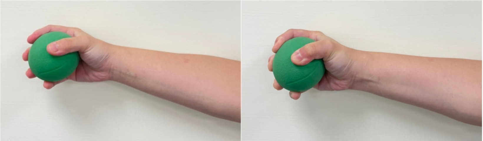 可利用橡膠球或握力器,將手握緊,維持10秒後放鬆休息,反覆做10次,每日做三回。