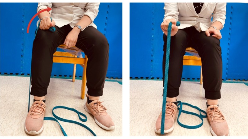 在傷後6~8週,可運用彈力繩幫助訓練前臂旋前肌群及手腕伸肌肌群。等長收縮的運動是指在關節靜止的狀態下收縮肌肉,避免活動到尚未痊癒的手腕關節但又能使關節附近的肌群獲得少量的肌力訓練。
