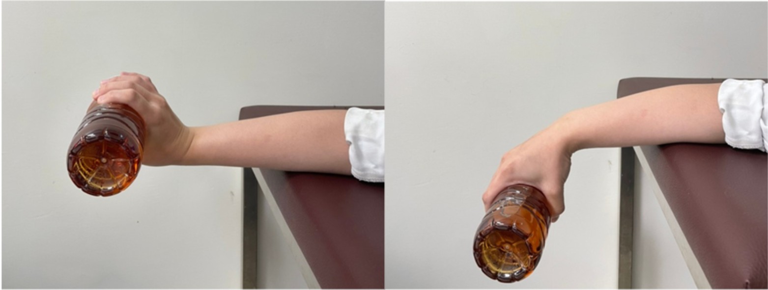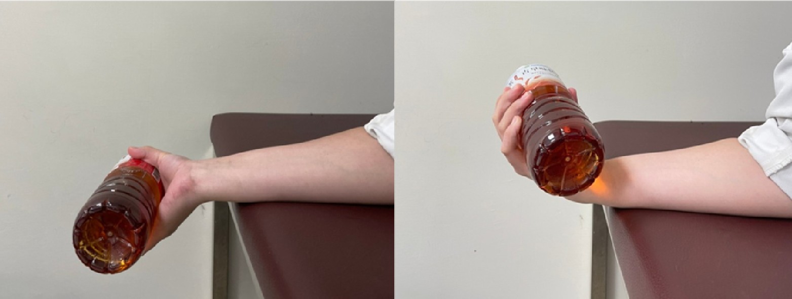 手握裝滿水的寶特瓶,掌心朝上,將手腕往上屈曲,維持10秒後放鬆休息,手腕放鬆時,不要過度往下,回到水平位置即可,反覆做10次,每日做三回,若有產生疼痛或其他的不適感就要停止休息。