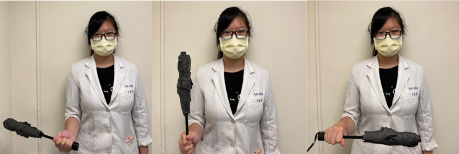 利用摺疊傘,上臂夾緊,前臂做旋後→正中→旋前緩慢來回運動,反覆做10次,每日做三回。因槓桿原理,摺疊傘拉的越長,重量越重,可依手的恢復狀況做調整喔!