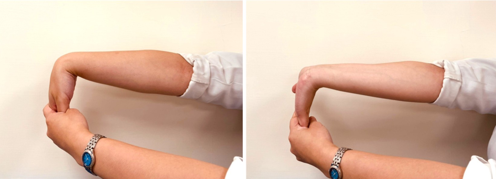 將患側手手肘伸直,掌心朝下或朝上,另一手將患側手腕往下彎曲,維持10秒鐘,反覆做10次,每日做三回。