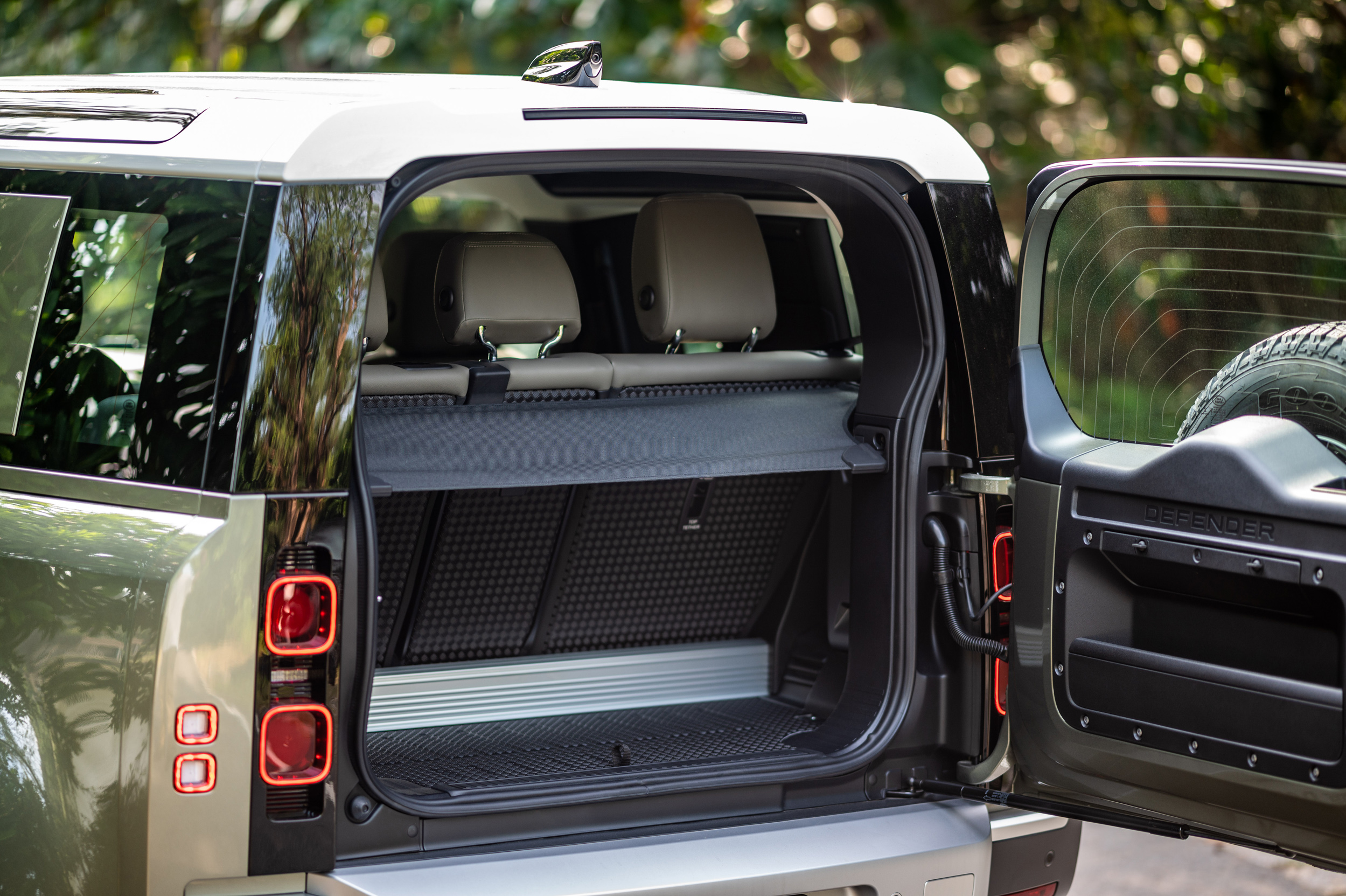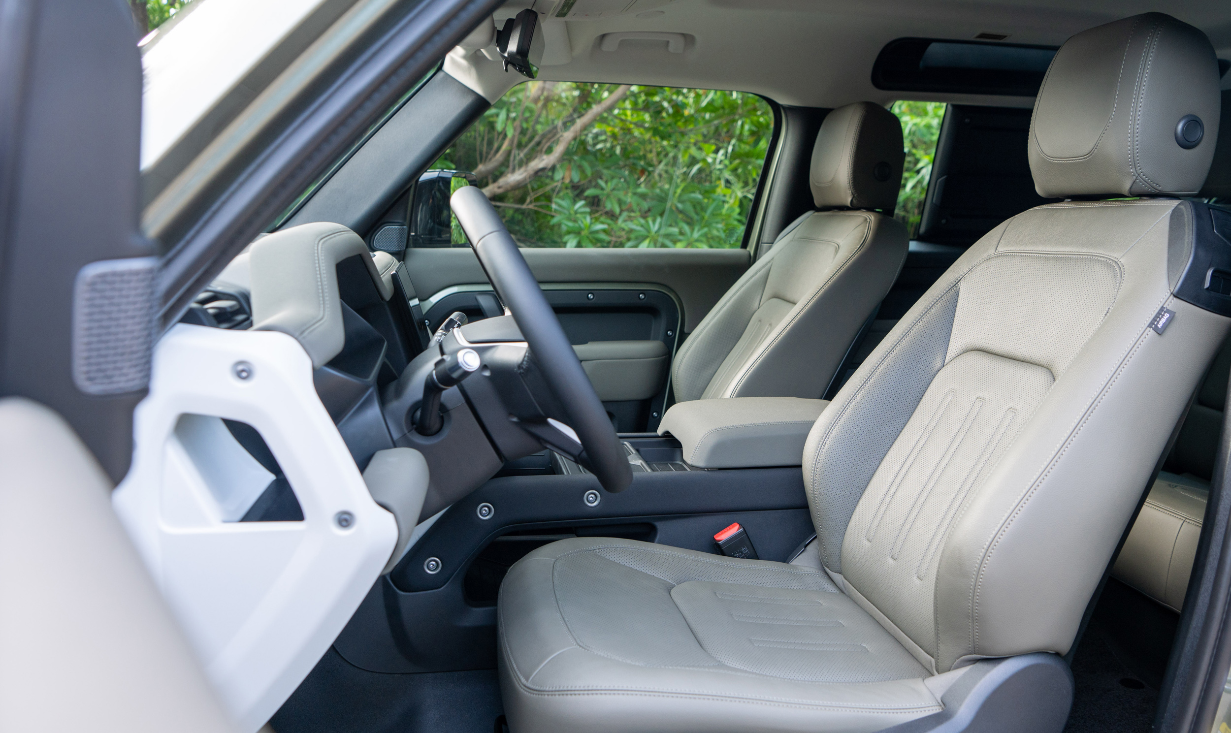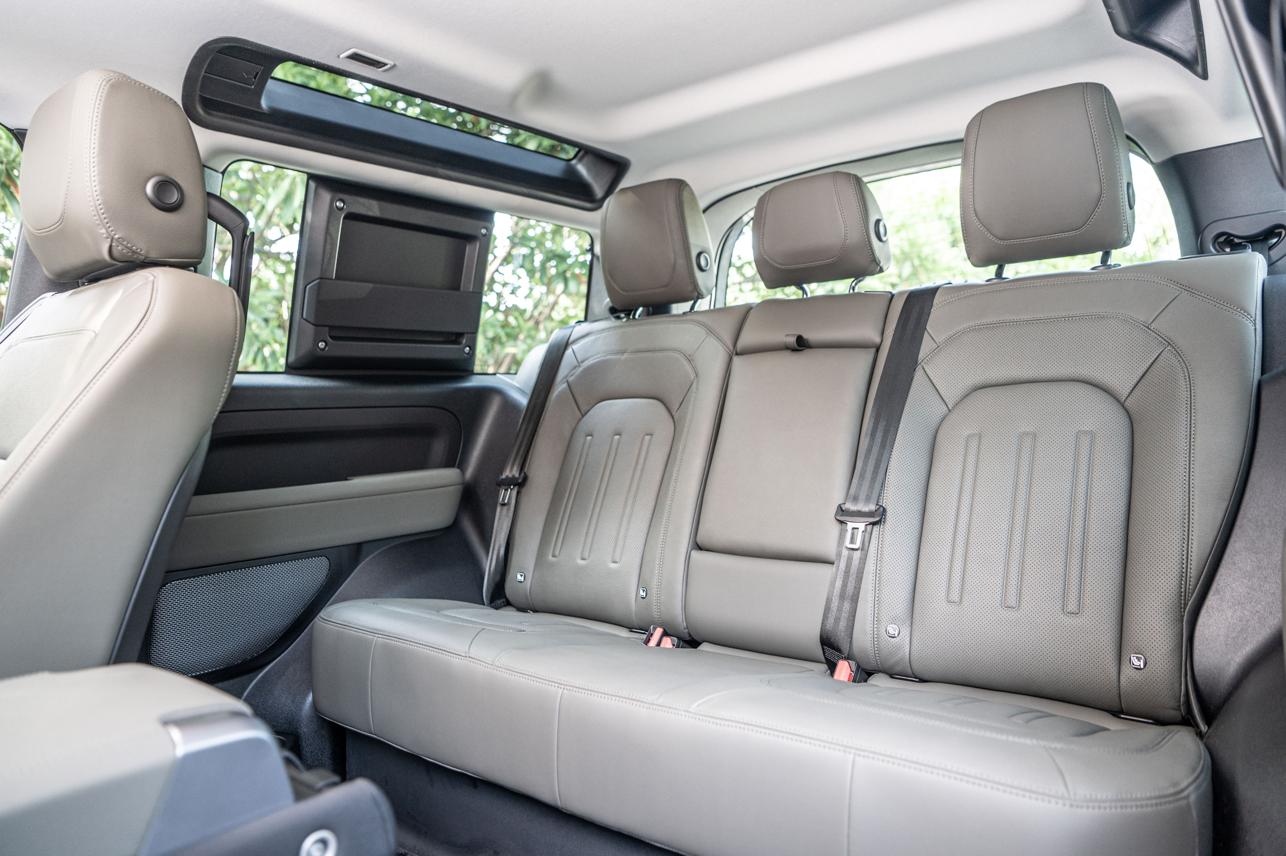 車室空間採5人座設定,2,587mm 的軸距創造與 Defender 110 車型近乎相同的乘坐空間舒適表現。雙前座座椅搭載粒面皮革與6項電動調整功能,包含四項電動腰靠與椅背傾斜。後排座椅可 40:20:40 分離式傾倒,兼容乘坐空間與載物收納需求。此外,90 車型擁有全車系唯一可供選配的折疊式帆布車頂。
