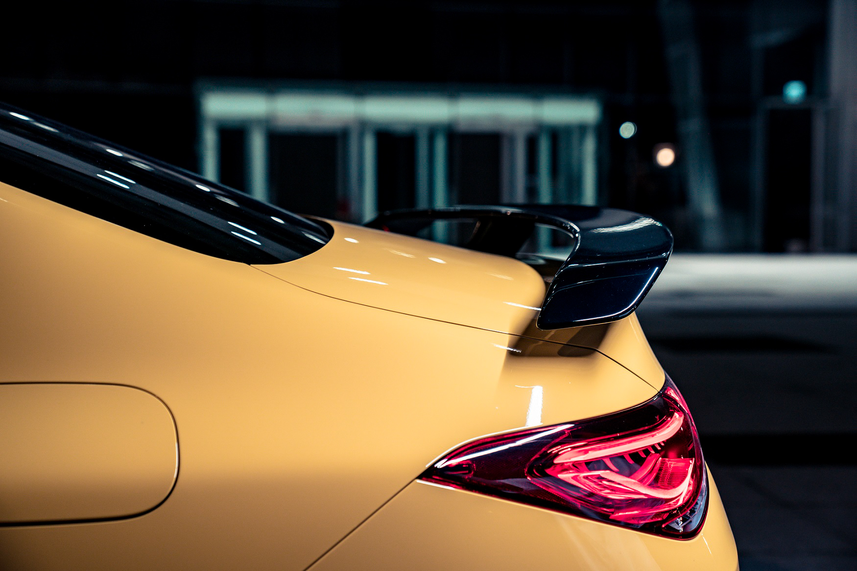 專屬於 CLA 35 4MATIC Coupé 與 CLA 45 S 4MATIC+ Coupé 黯夜版的「進階 AMG 空力套件」,亮黑色的加大前下擾流板、後保桿外側導流片、後下定風翼及加大固定式後擾流尾翼,增加下壓力與極限操駕時的穩定性。