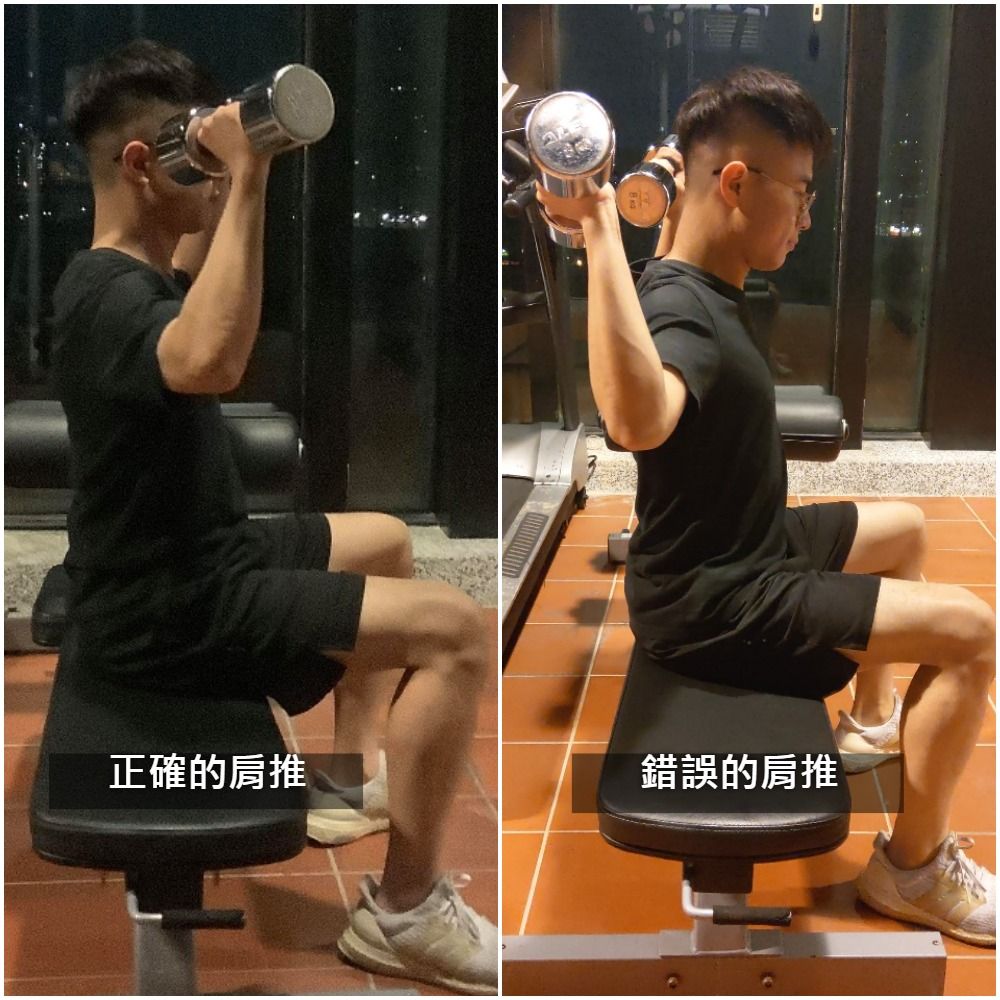 正確的肩推:肩關節水平內收30度(手肘要在軀幹前方),避免肩外旋同時又水平外展過度。