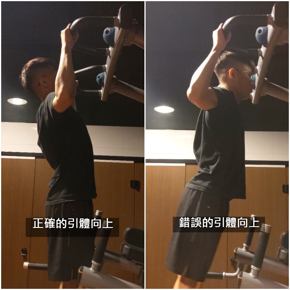錯誤的引體向上:手肘位於頸部後方,容易造成肩關節過度水平外展、外轉,造成肩夾擠。