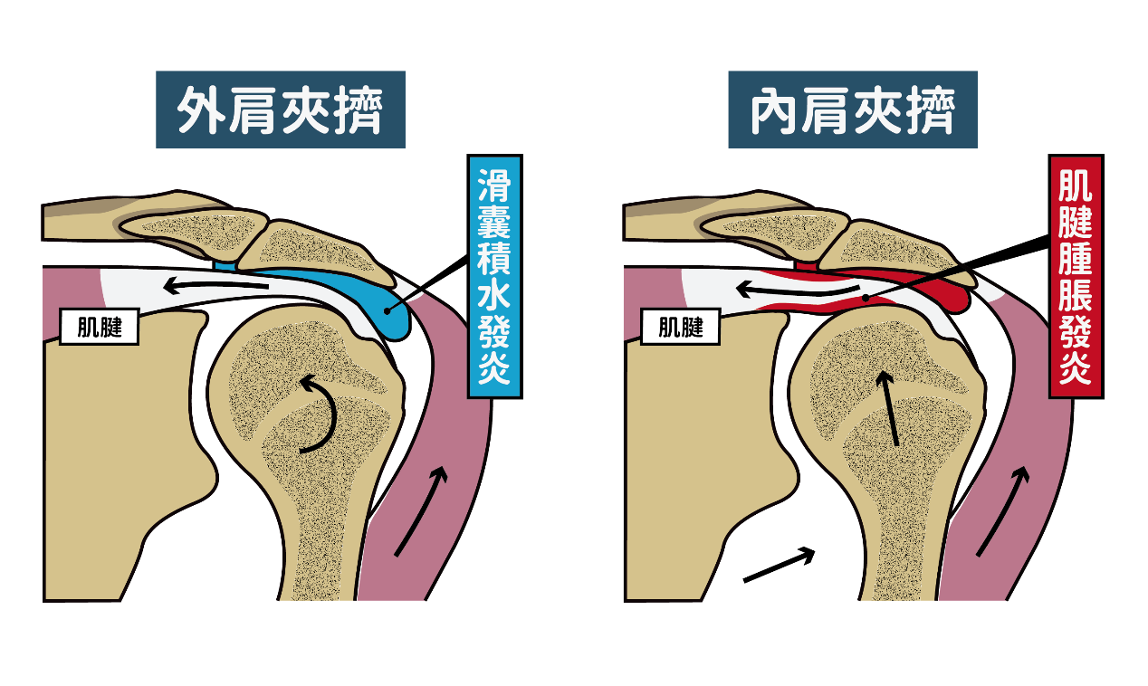 林杏青表示,肩夾擠有不同的機制,依照成因不同分為「原發性」與「次發性」肩夾擠;原發性肩夾擠是直接摩擦導致的肩夾擠,旋轉肌和肩峰下滑囊因為動作反覆摩擦擠壓,引起滑囊及肌腱發炎;次發性肩夾擠又可因為位置的不同分為「外肩夾擠」、「內肩夾擠」。