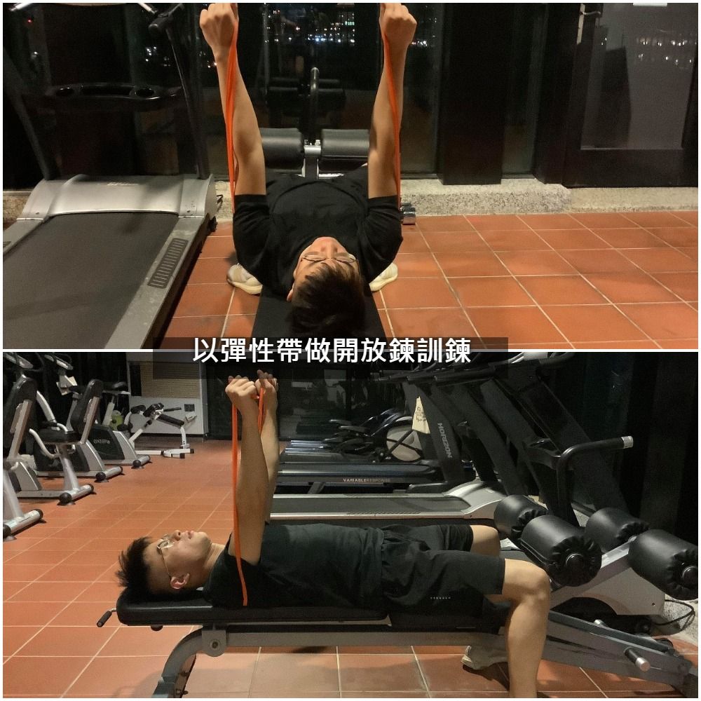 -以彈性帶做開放鍊訓練:雙手打直盡量向天空延伸拉動彈性帶,維持15秒。