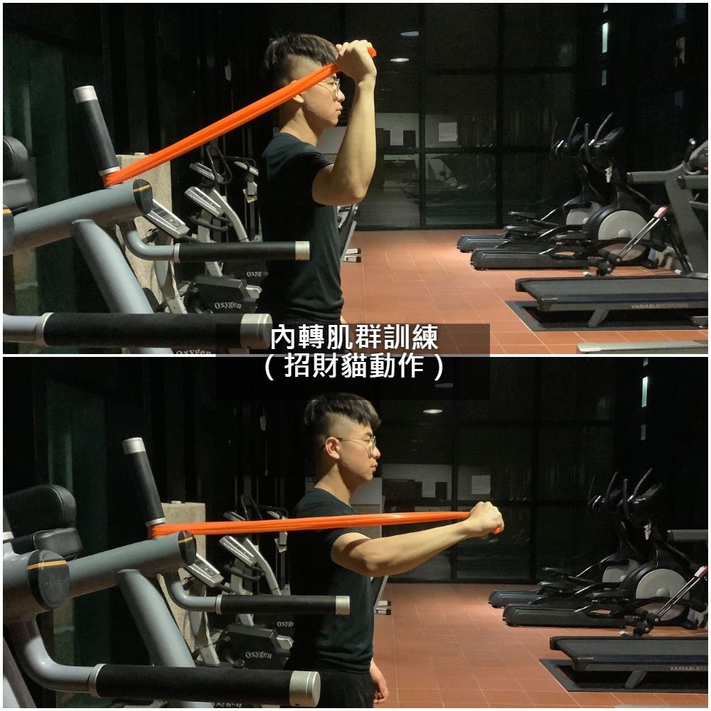 -內轉肌群訓練:肩胛平面範圍內(肩關節維持水平內收30度),屈曲90度,手肘位置固定不動,做出肩關節前旋轉拉動彈性帶(招財貓動作)。