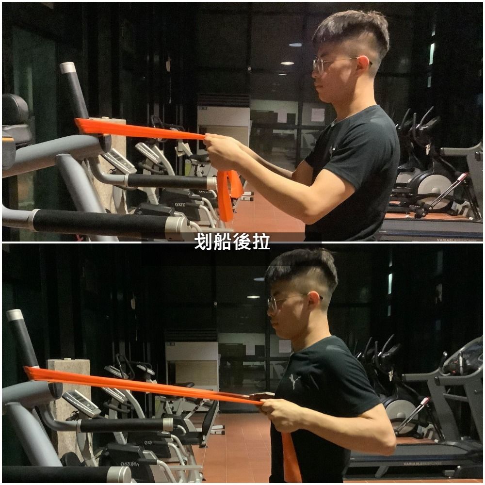 -划船後拉(Rows):手拉彈性帶,以背肌力量將肩胛骨向脊椎夾肩胛骨內收,帶動手臂向身體後方拉彈性帶,過程中保持手肘靠向軀幹,拉完後慢速放回彈性帶。