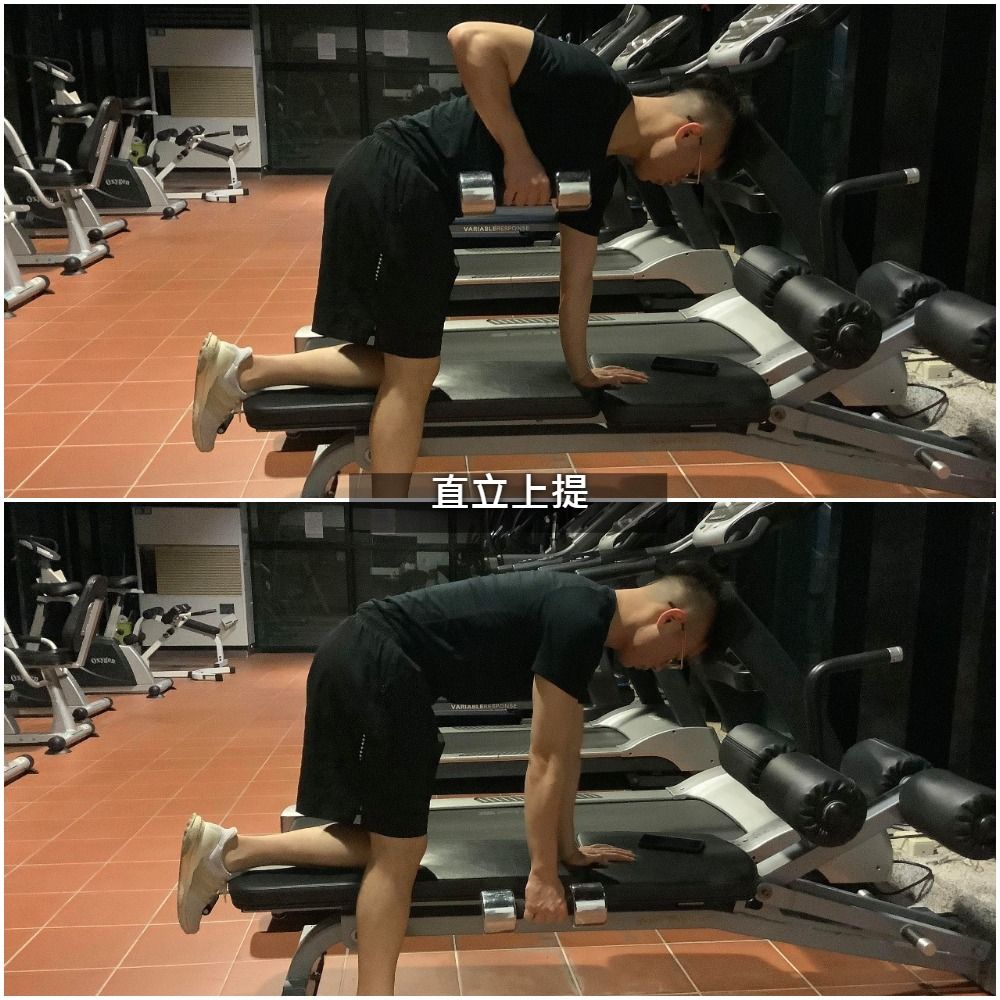 -直立上提(Upright row):以手和膝蓋支撐在凳子上,單手拿啞鈴以背肌力量將肩胛骨向脊椎夾(肩胛骨內收),帶動手臂向身體後方提起啞鈴,過程中保持手肘靠向軀幹,後慢速放下啞鈴。