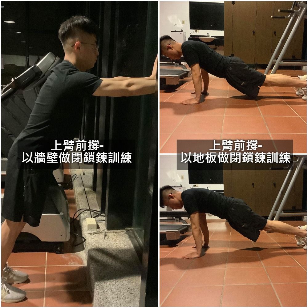 -上臂前撐(Push up plus):身體軀幹打直,向前斜靠在牆壁上,雙手打直支撐身體重量,手盡量往牆壁方向推,反作用力下,會將身體像後推動些許幅度,維持此姿勢15秒,以牆壁做閉鎖鍊;再進階對地板做閉鎖鍊訓練,身體軀幹打直,雙手打直支撐身體重量,雙手盡量往地面推,反作用力下,會將身體向上推動些許幅度,維持此姿勢15秒。