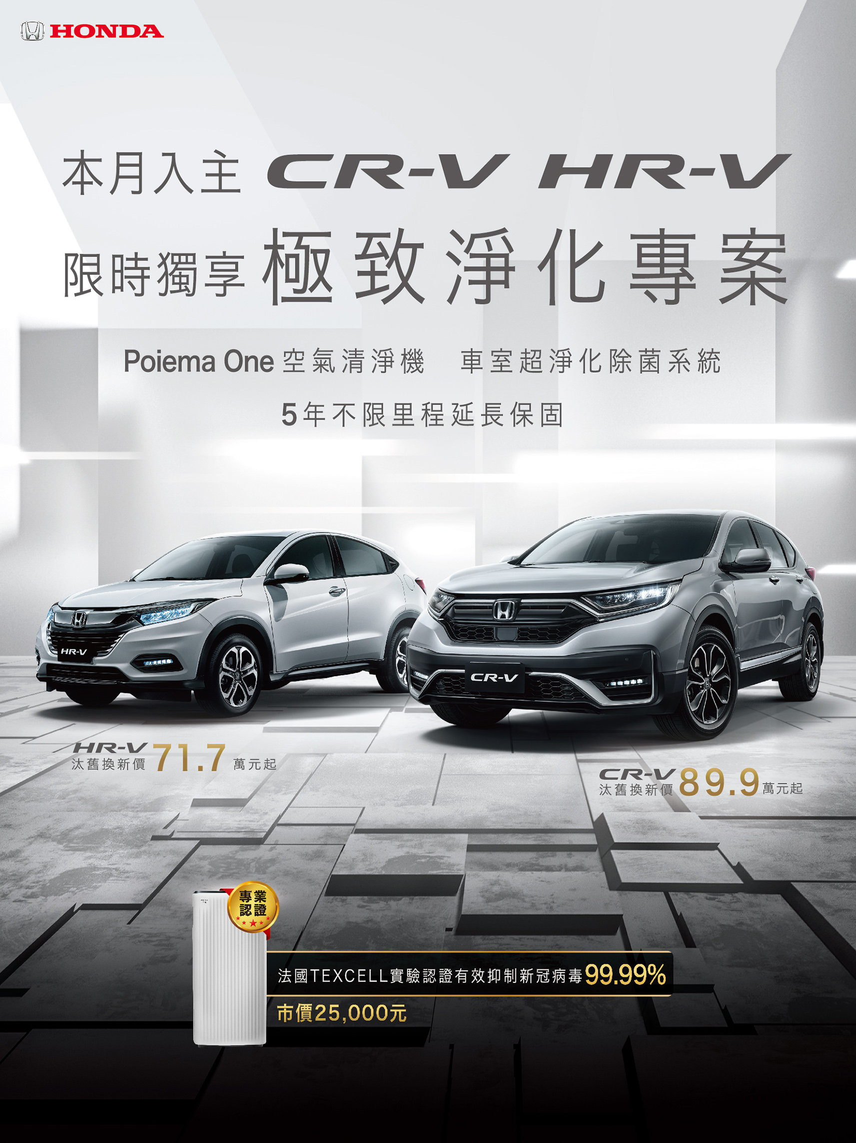 本月入主 CR-V、HR-V 指定車型限時獨享多重好禮,可免費升級法國 TEXCELL 實驗認證有效抑制新冠病毒 99.99% 之 Poiema One 空氣清淨機、車室超進化除菌系統及 5 年不限里程延長保固。誠摯邀請廣大消費者蒞臨,或電洽 Honda 全方位顧客服務專 0800-666-789、登入 Honda Taiwan 官方網站 https://www.honda-taiwan.com.tw/auto 了解更多新車資訊及超值禮遇方案。