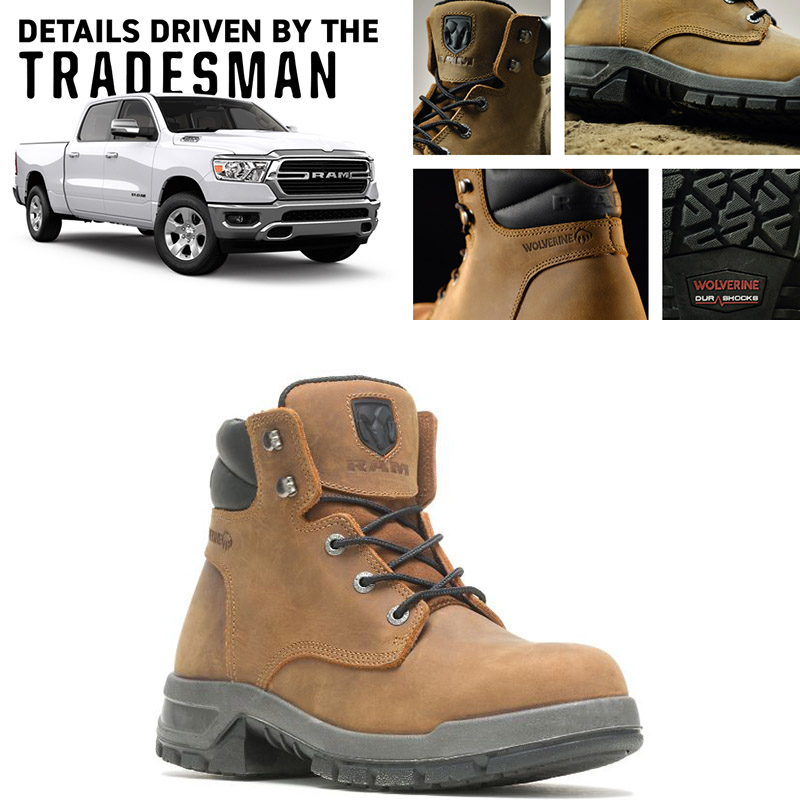Ram與Wolverine共同推出的工作靴,自然融合了兩者的特色,共計推出三款工作靴,其中Tradesman鞋款是以Ram 1500皮卡為設計靈感來源,有著簡潔的設計,鞋舌上有著Ram著名的公羊廠徽,定價為225美元〈約合新台幣6,300元〉,並有米色與白色兩種選擇。