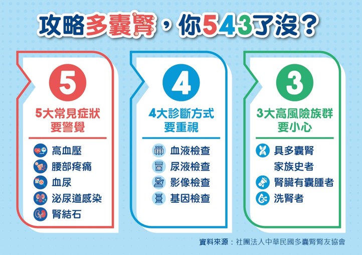 為了幫助患者及早揪出多囊腎,掌握黃金控制期,中華民國多囊腎腎友協會特別在9月4日世界多囊腎關注日前,宣導「攻略多囊腎,你543了沒?」口訣!提醒民眾出現『高血壓、腰部疼痛、血尿、泌尿道感染、腎結石』這五大常見症狀,盡速就醫進行『影像、血液、尿液、基因』上述四種診斷檢查,特別是『具家族史、腎臟有囊腫、洗腎者』這三大高風險族群,更要提高警覺。