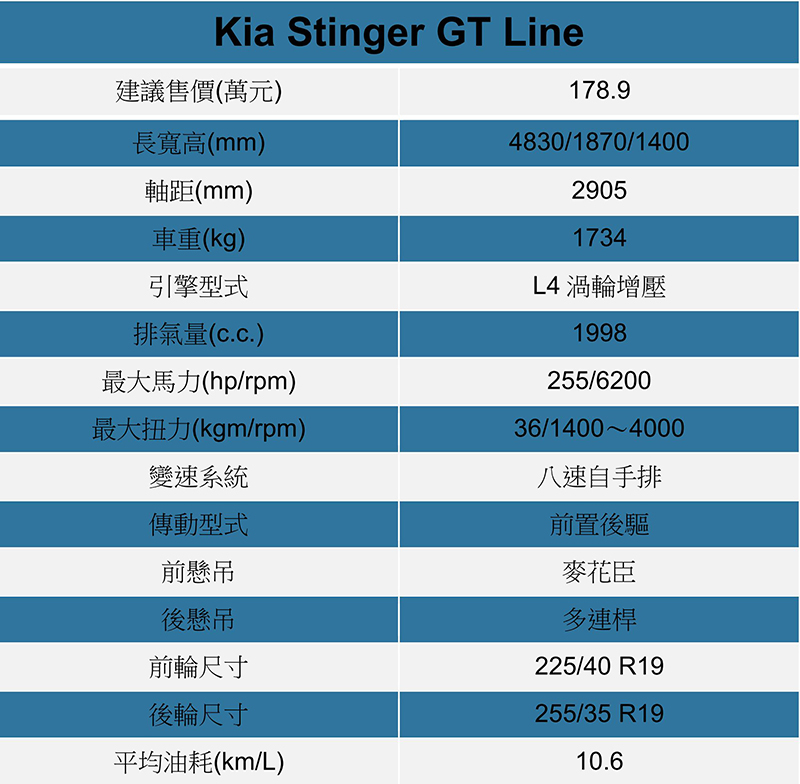 Stinger是Kia品牌首款性能轎跑車,雖非品牌最新世代車型,但不可否認Stinger於當時可是讓Kia注入許多科技、配備和讓人驚艷的調校功力,不過在車市環境轉變與消費者觀念,這類GT轎跑車需求是愈來愈少,但要以不到180萬元買到尺碼近4米9轎跑車、255匹馬力與半自動駕駛,確實只有Stinger可選。